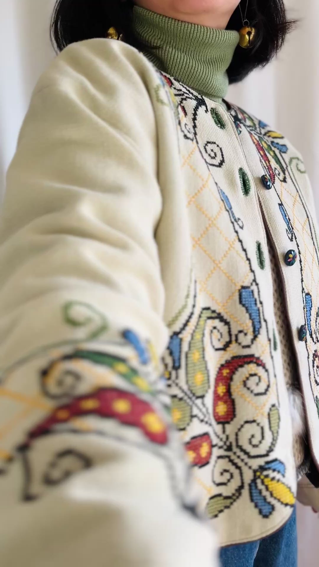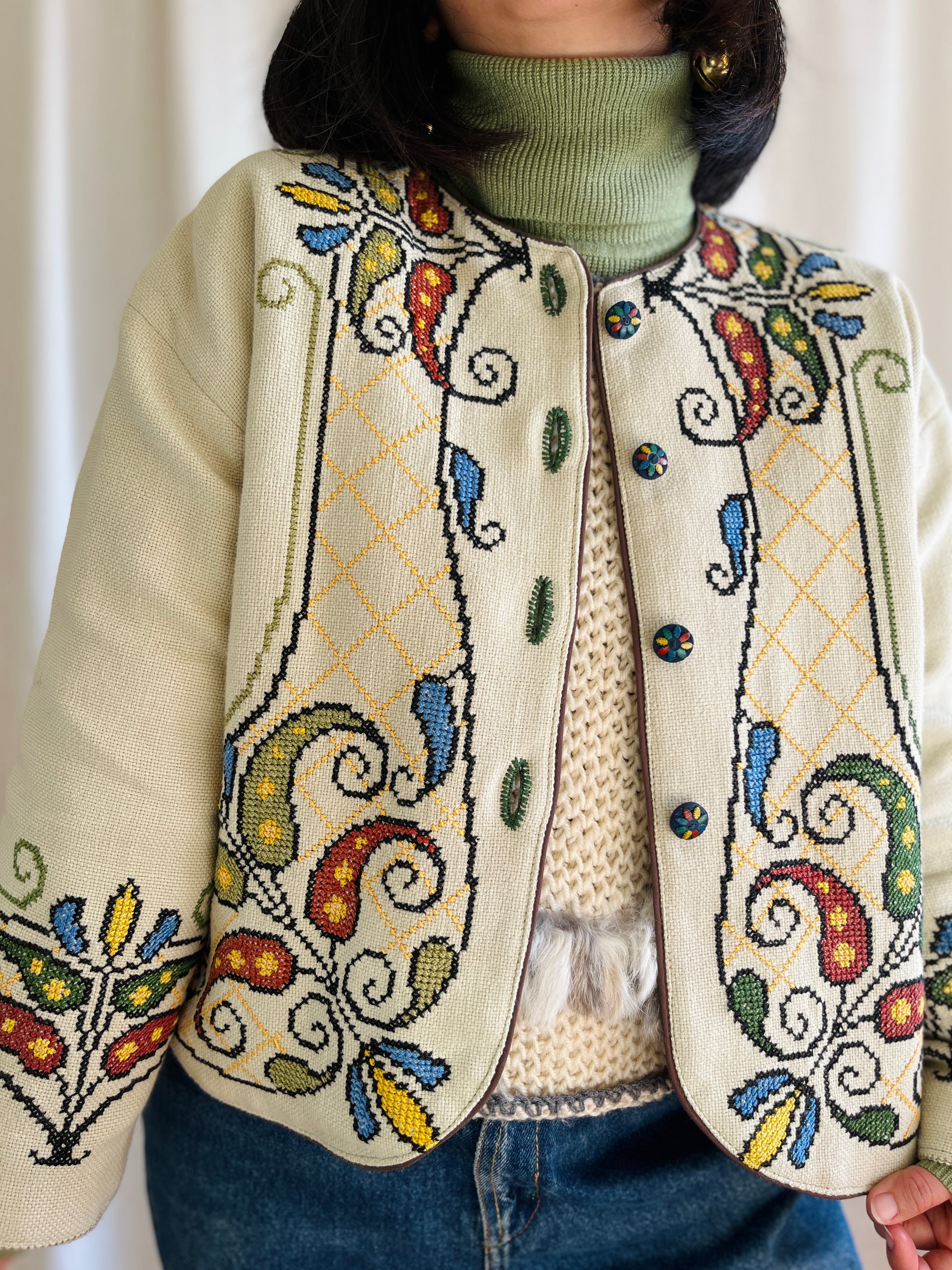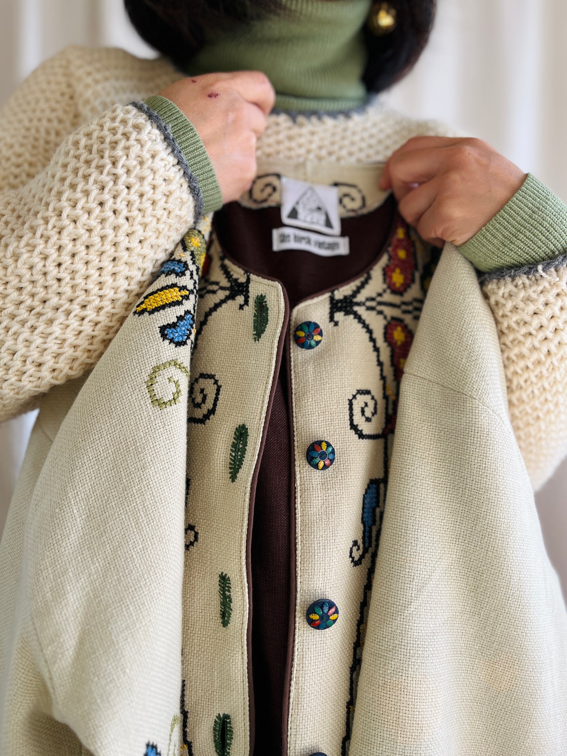 A jacket that showcase the best part of a very delicately made hand embroidered tablecloth from the 60s. Matching with antique hand painted wood buttons, one inner pocket. Many details of the making involved just hand stitching.