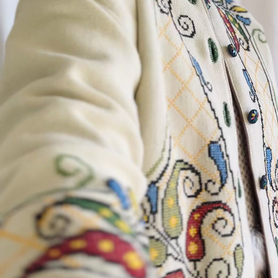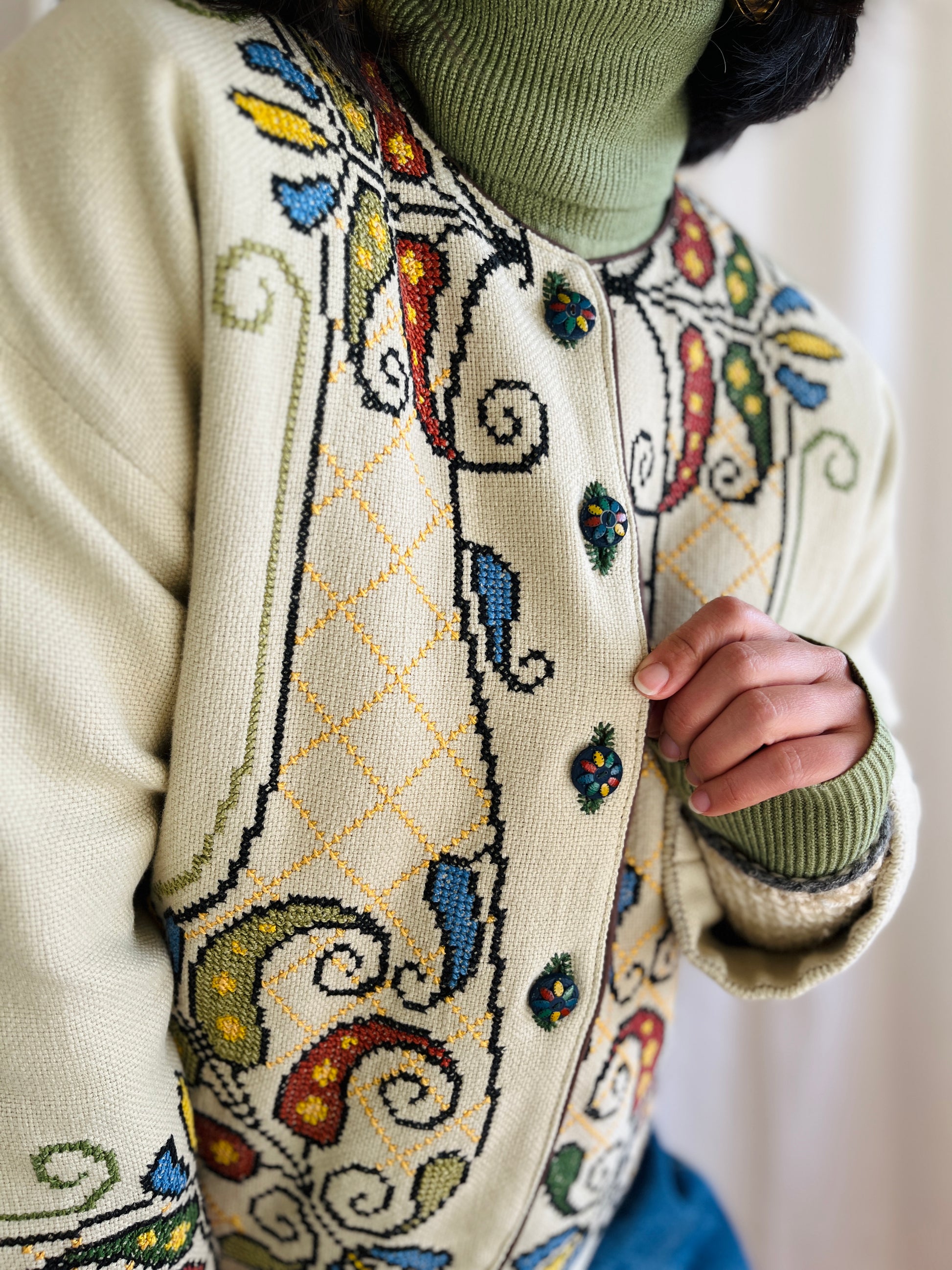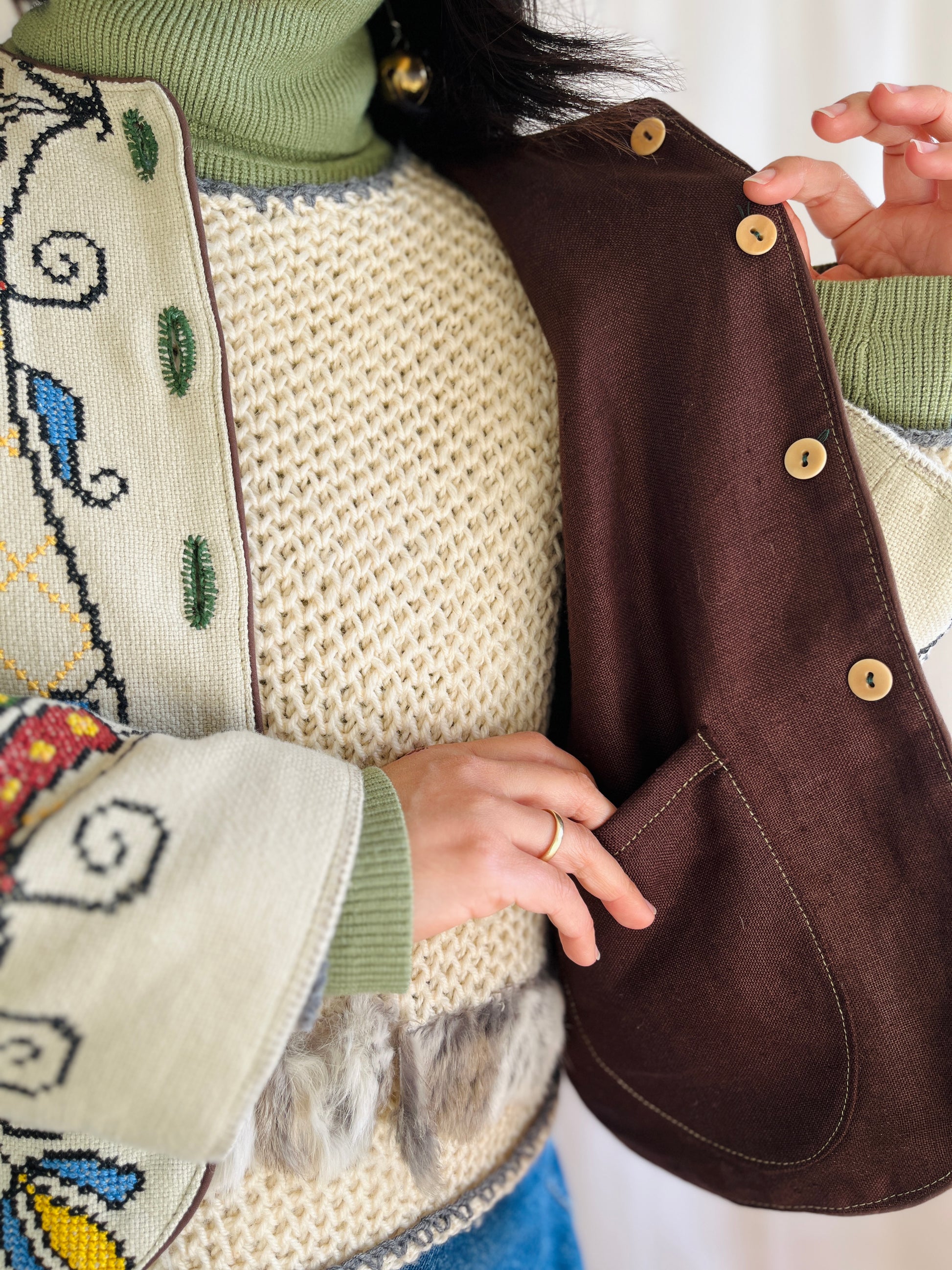 A jacket that showcase the best part of a very delicately made hand embroidered tablecloth from the 60s. Matching with antique hand painted wood buttons, one inner pocket. Many details of the making involved just hand stitching.