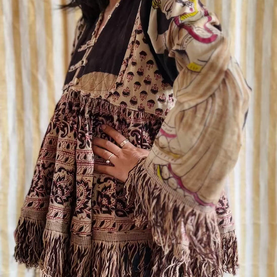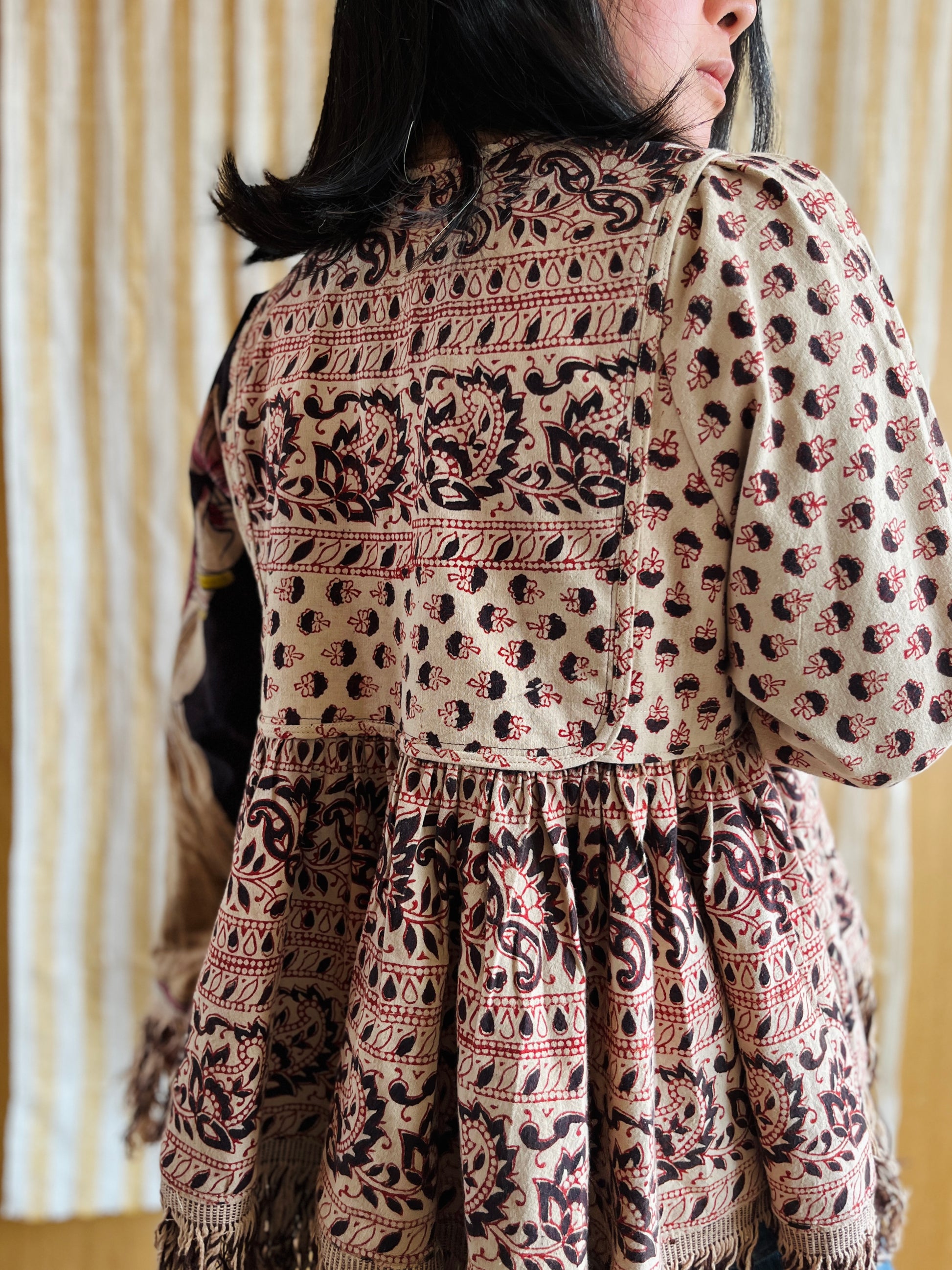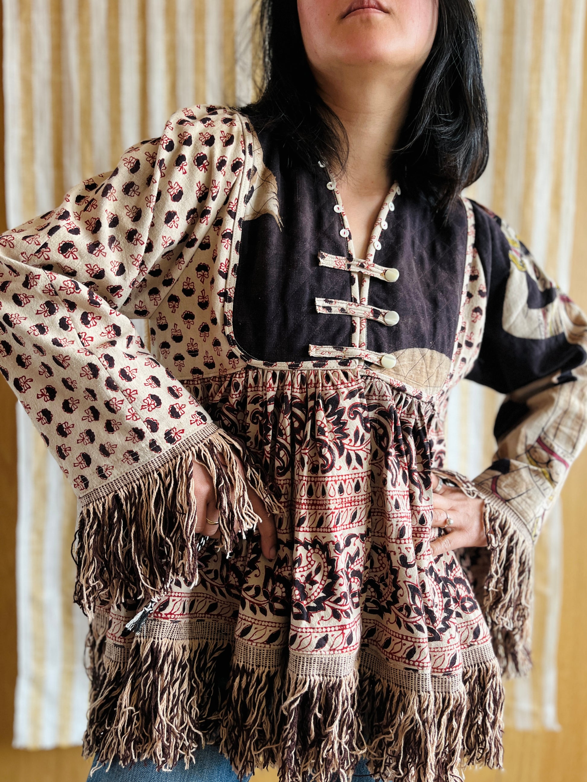 This jacket / blouse is made from a very large piece of vintage hand block print bedspread from India. The fringes are originally from the textiles as well.
