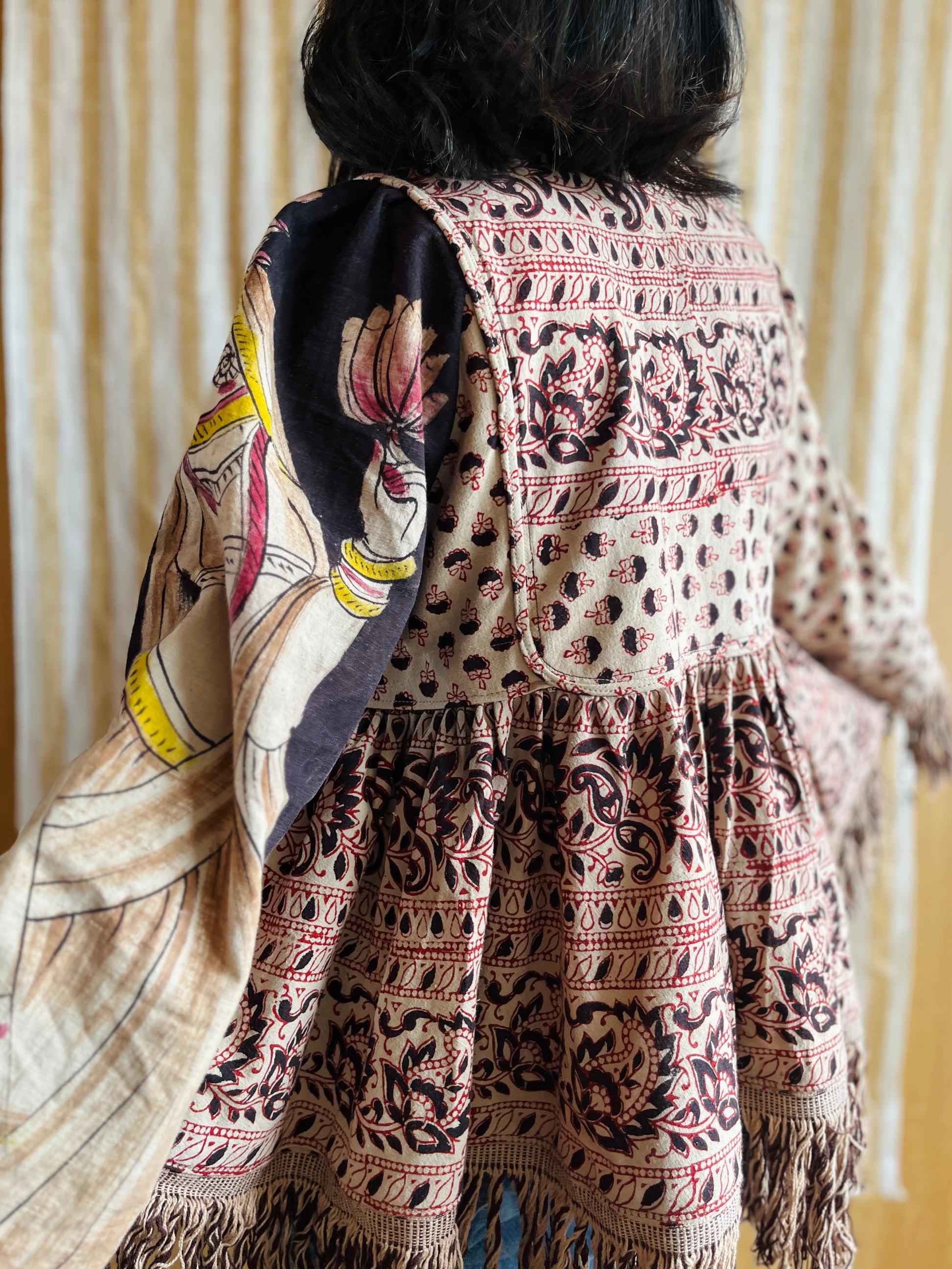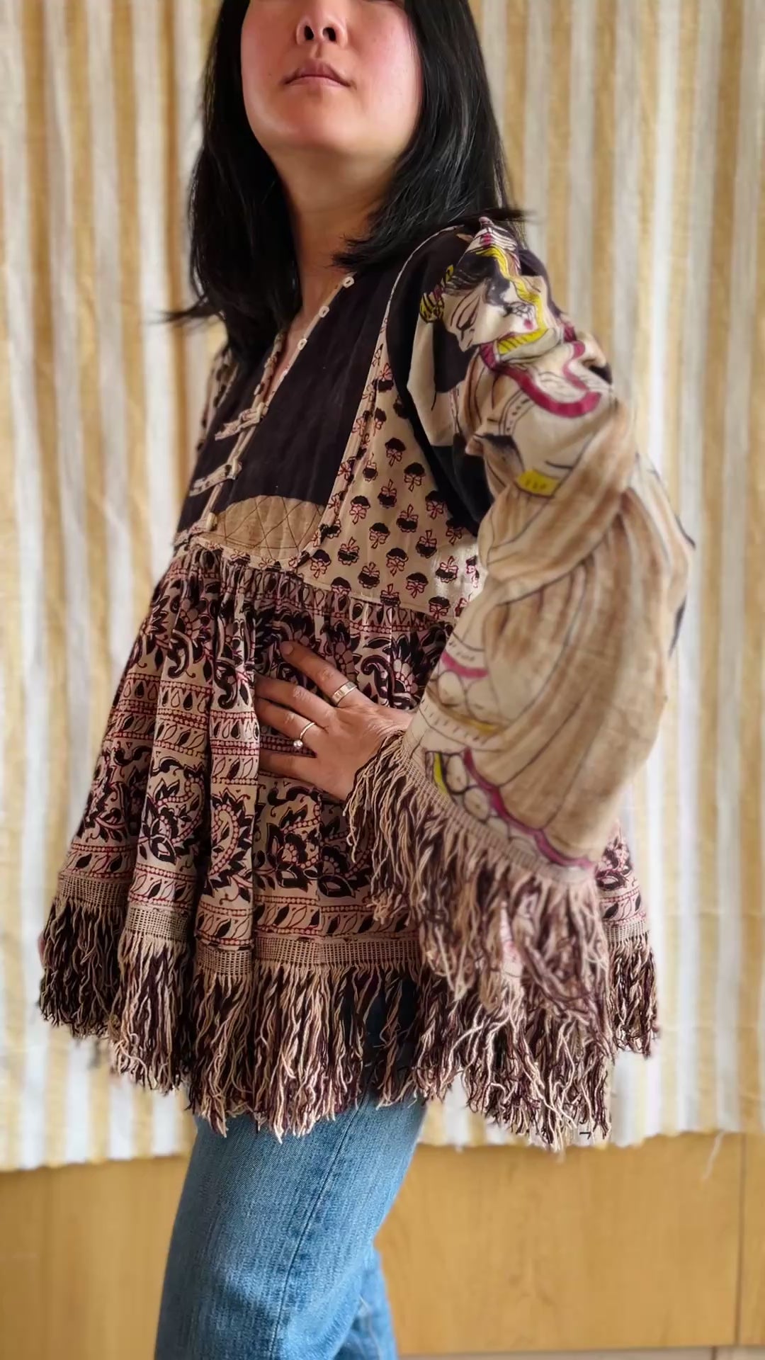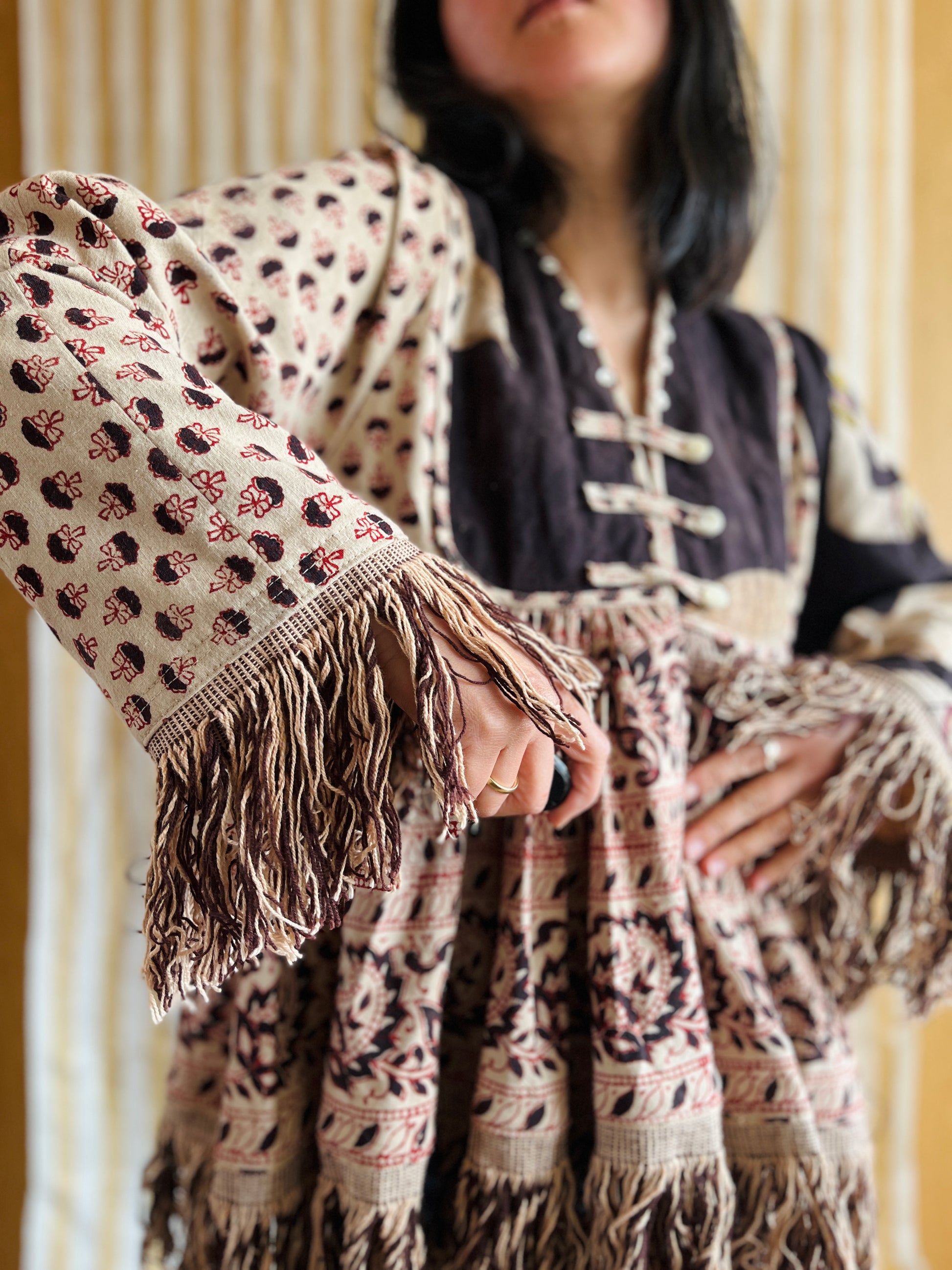 This jacket / blouse is made from a very large piece of vintage hand block print bedspread from India. The fringes are originally from the textiles as well.
