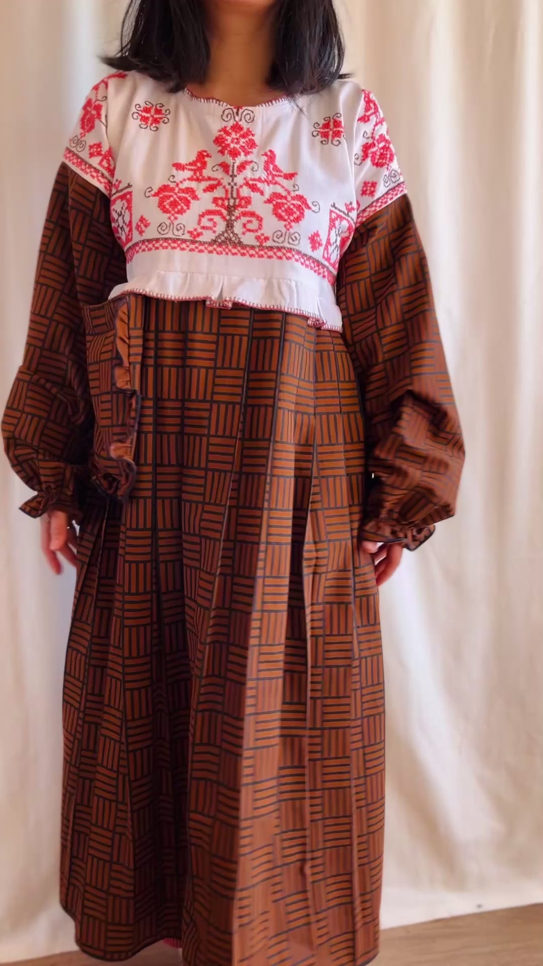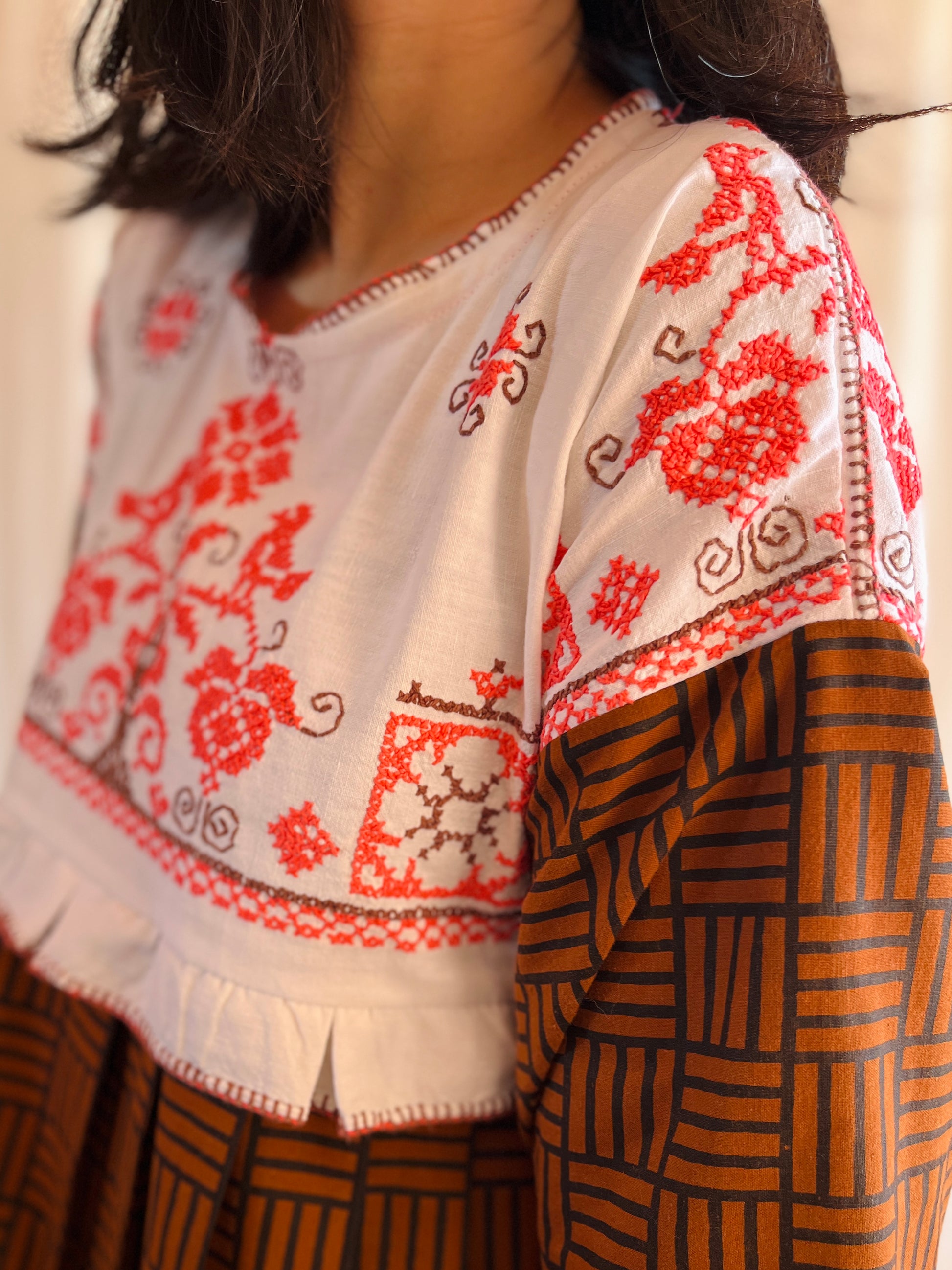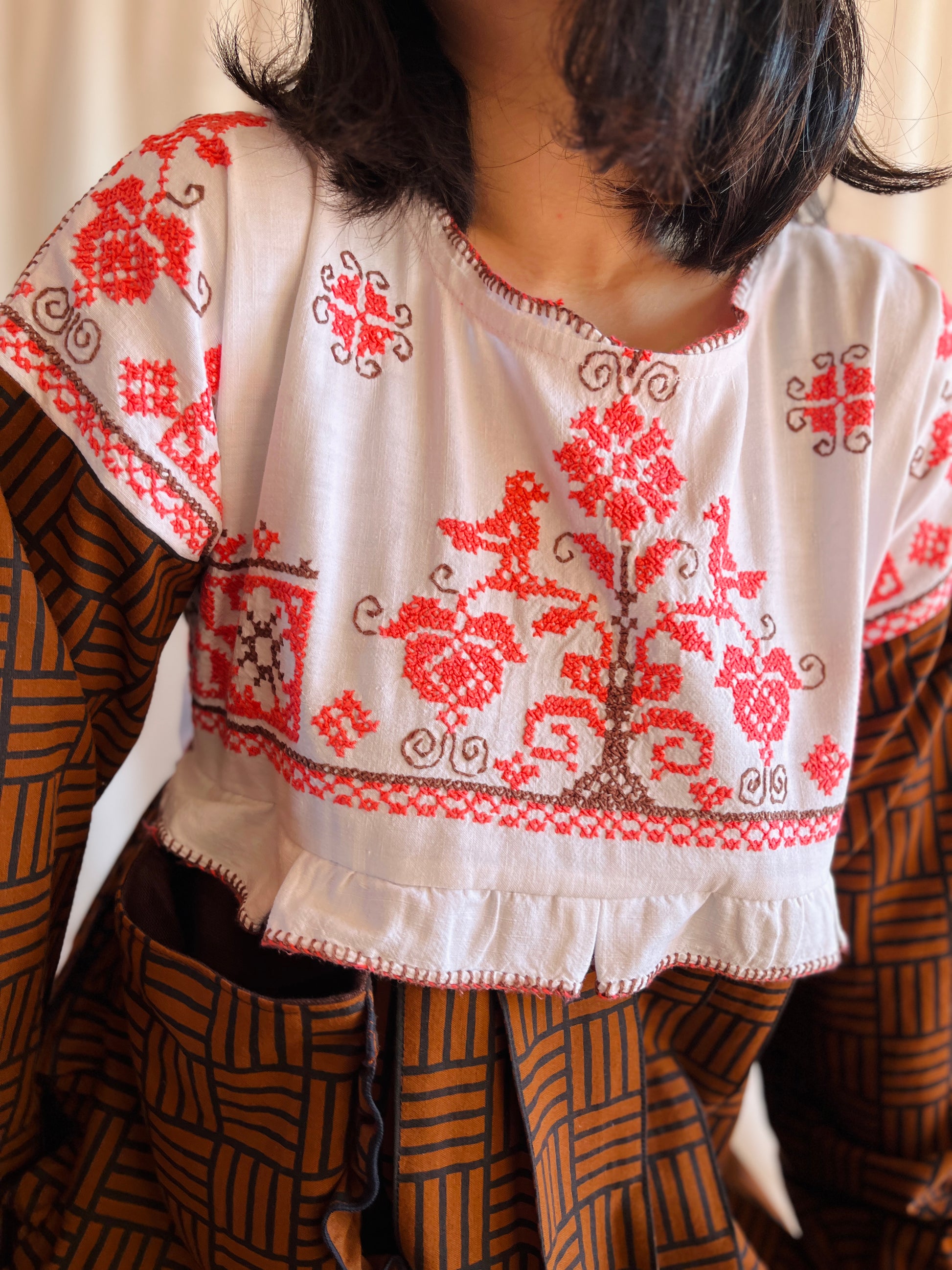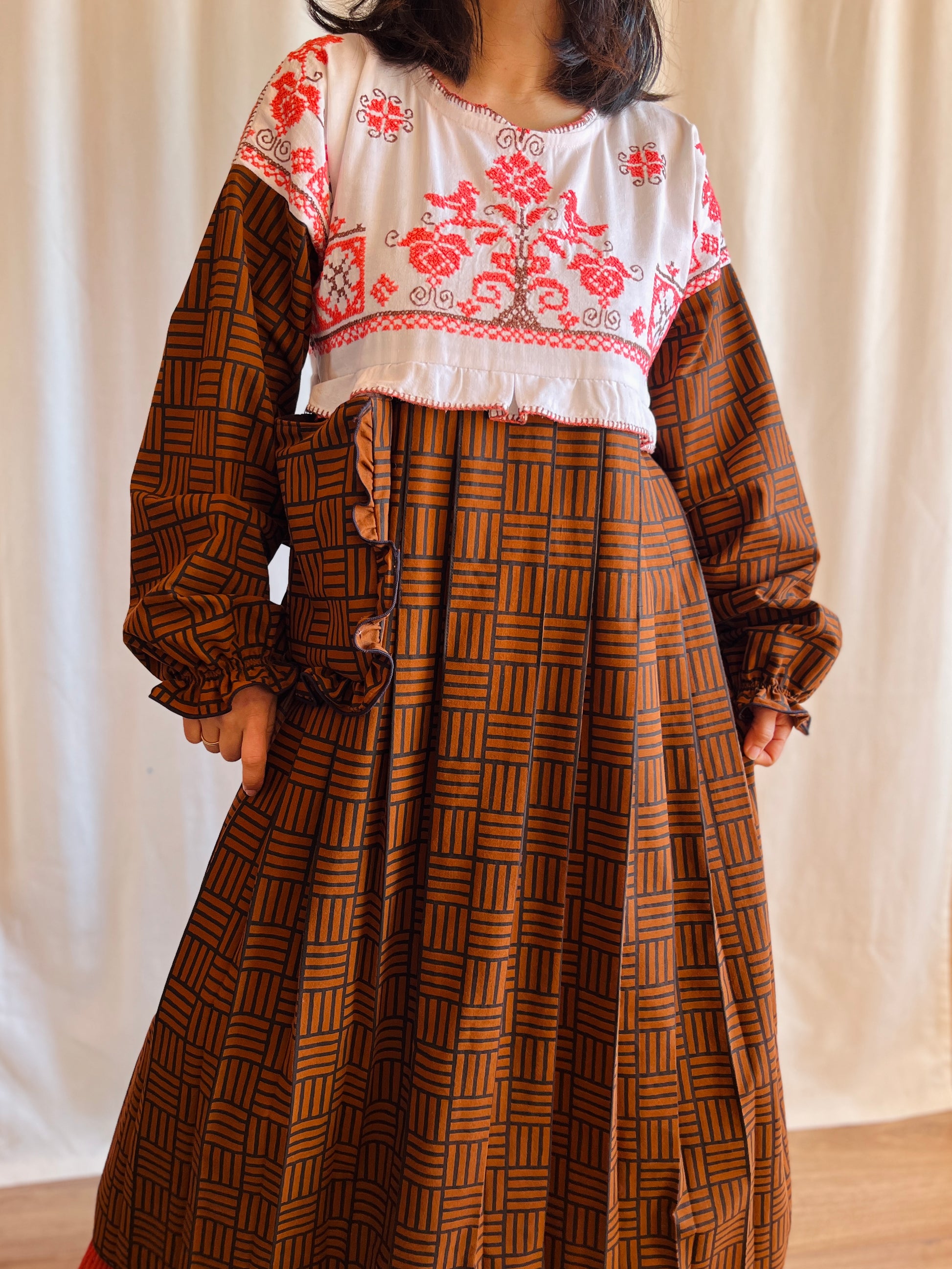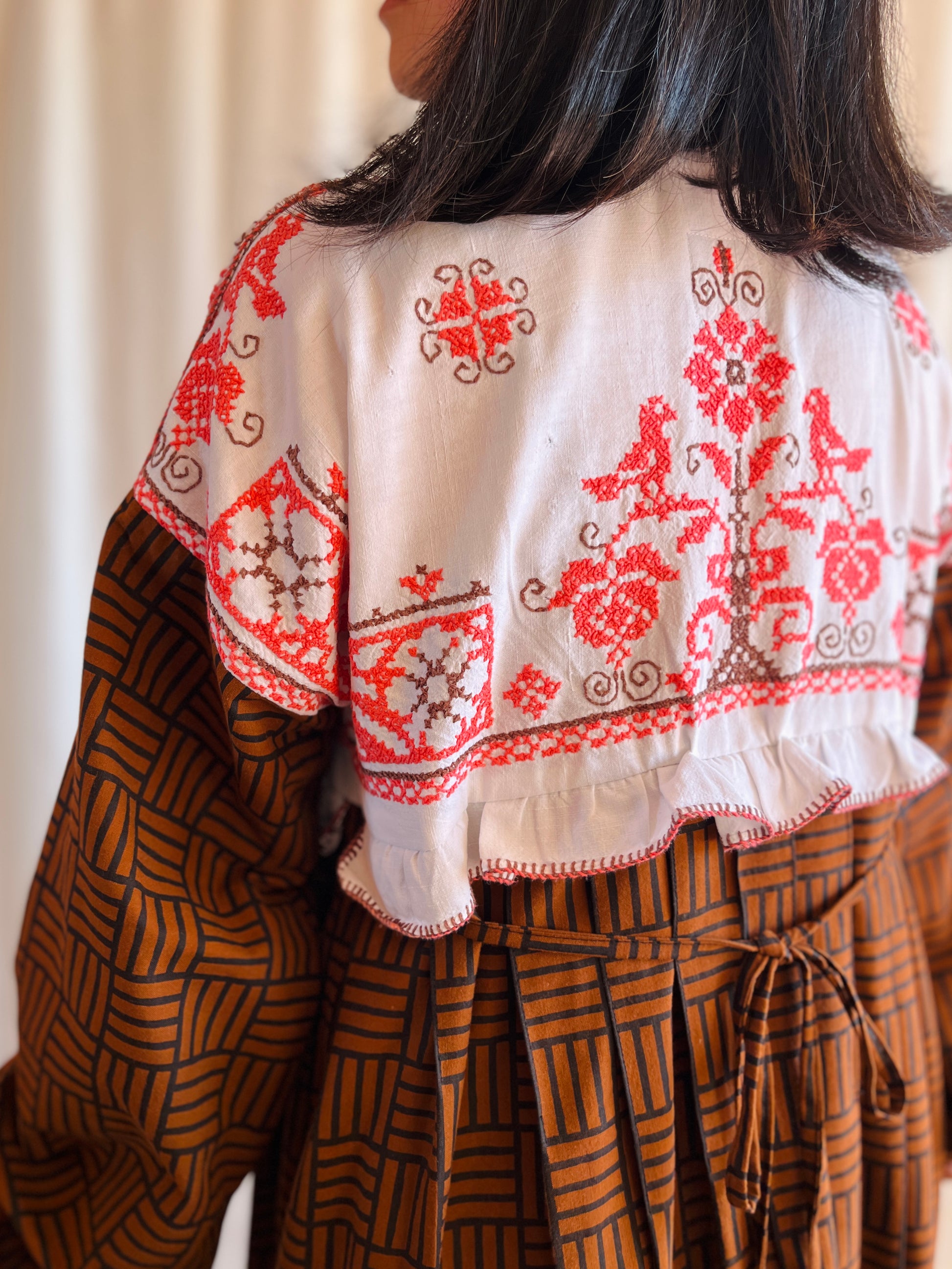 This dress is made from a cross stitch tablecloth with unusual bubble gum pink cotton threads. The stitch work is wild, you could tell that the tablecloth have been washed so many time, it create such textures that no machine can simulate that. Some threads are loose, some trim are ripped but it stands right there with time.