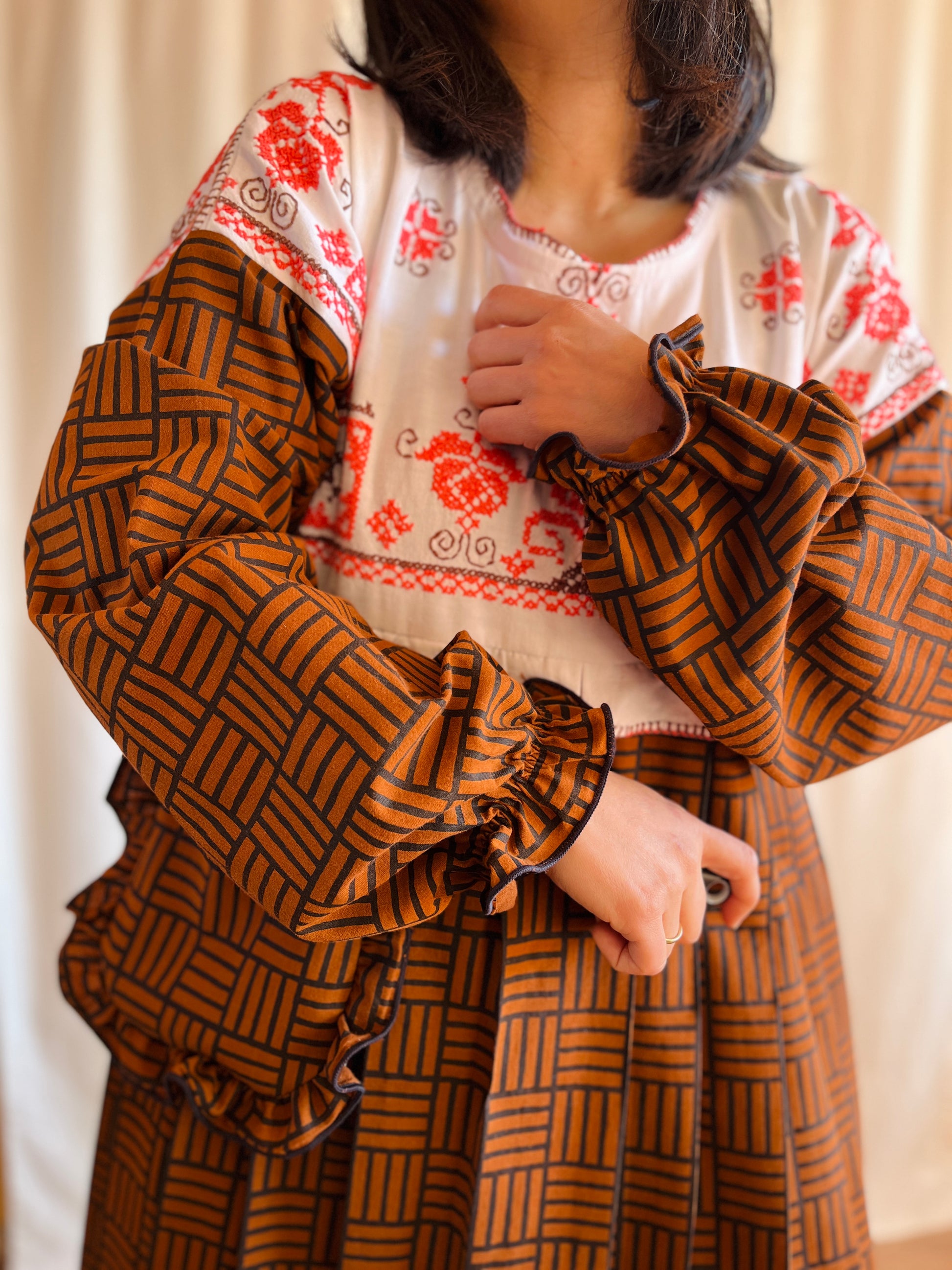 The body and sleeves parts are made from reclaim bed linen (Vintage ikea bed sheet made in Denmark from the good old days).