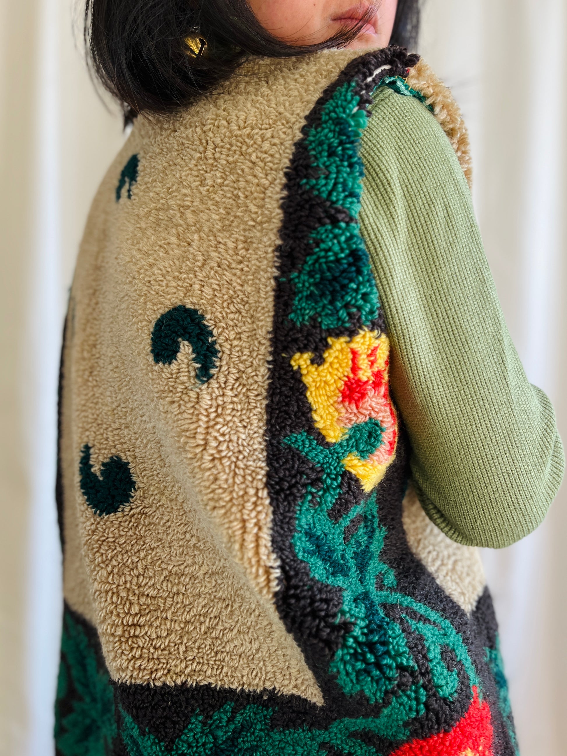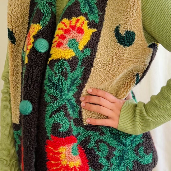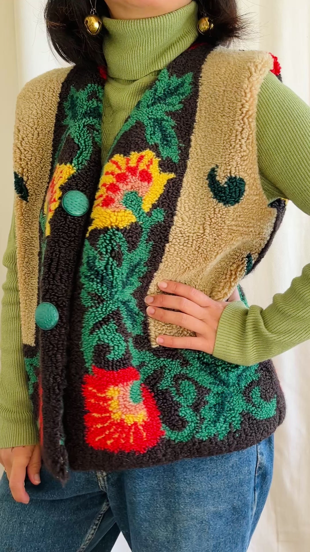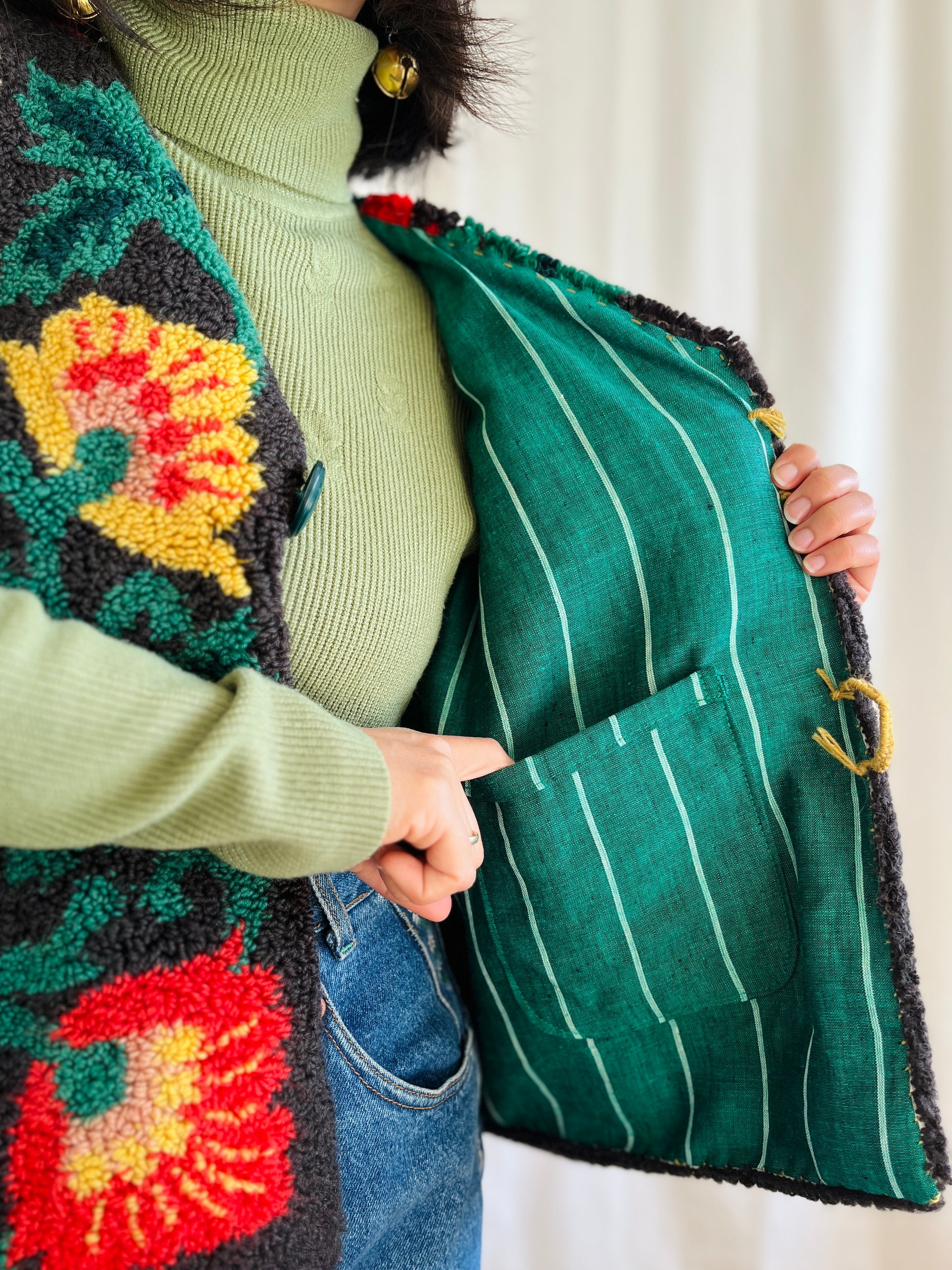A very unique piece of creation, made from a handmade wool rug, soft and warm. featuring one inner pocket and fully lined with linen fabric. Closes with two vintage buttons.