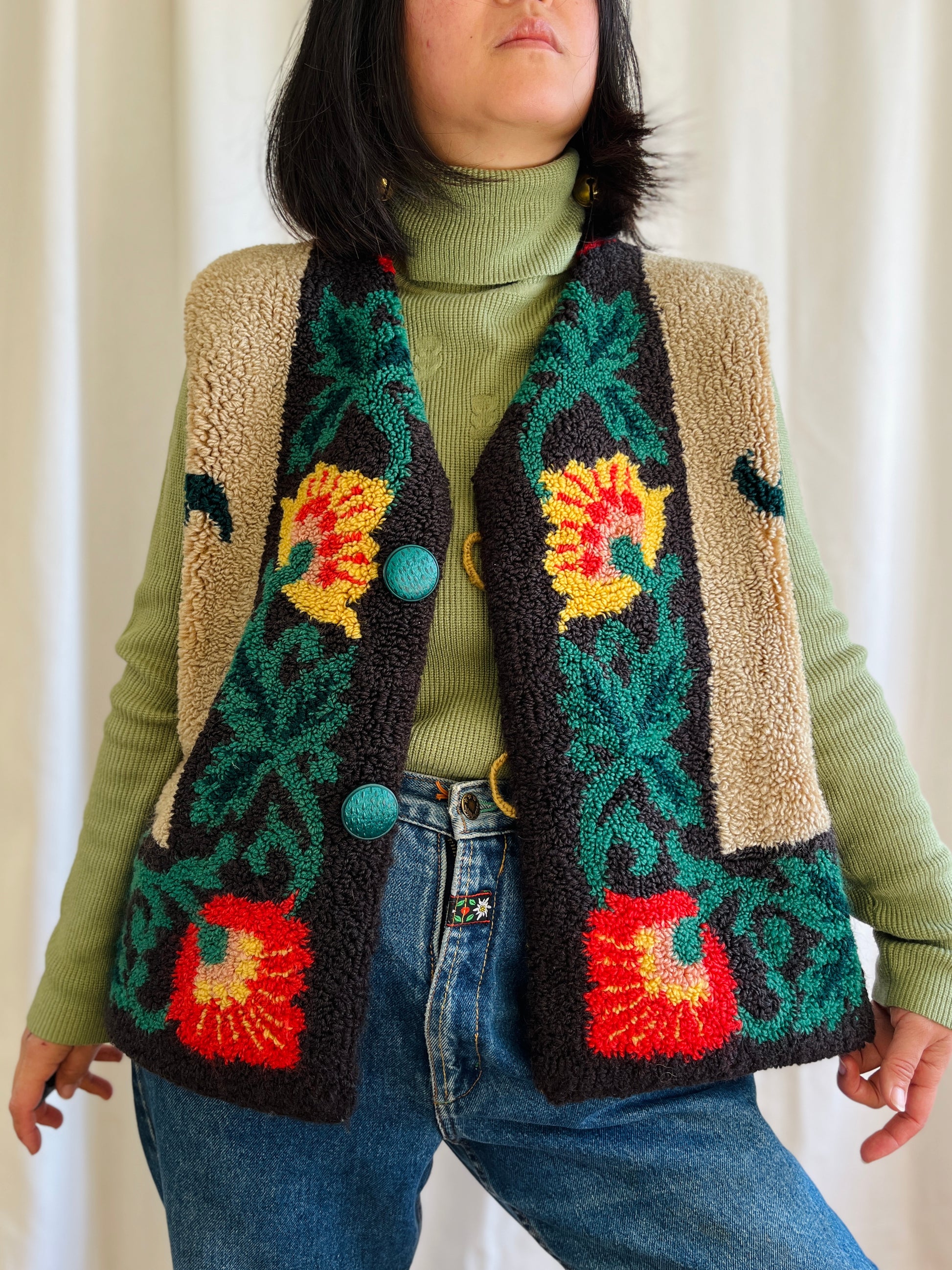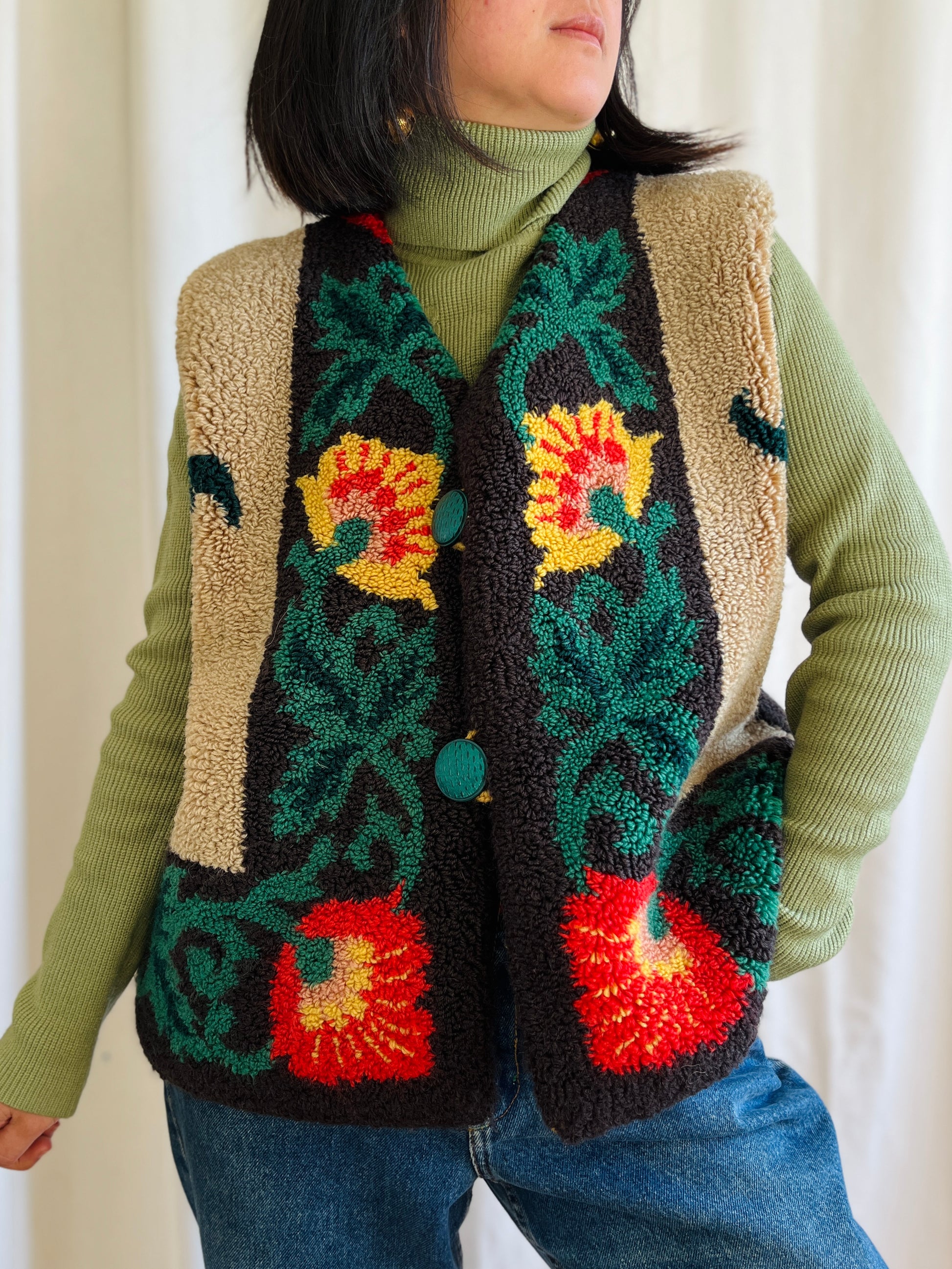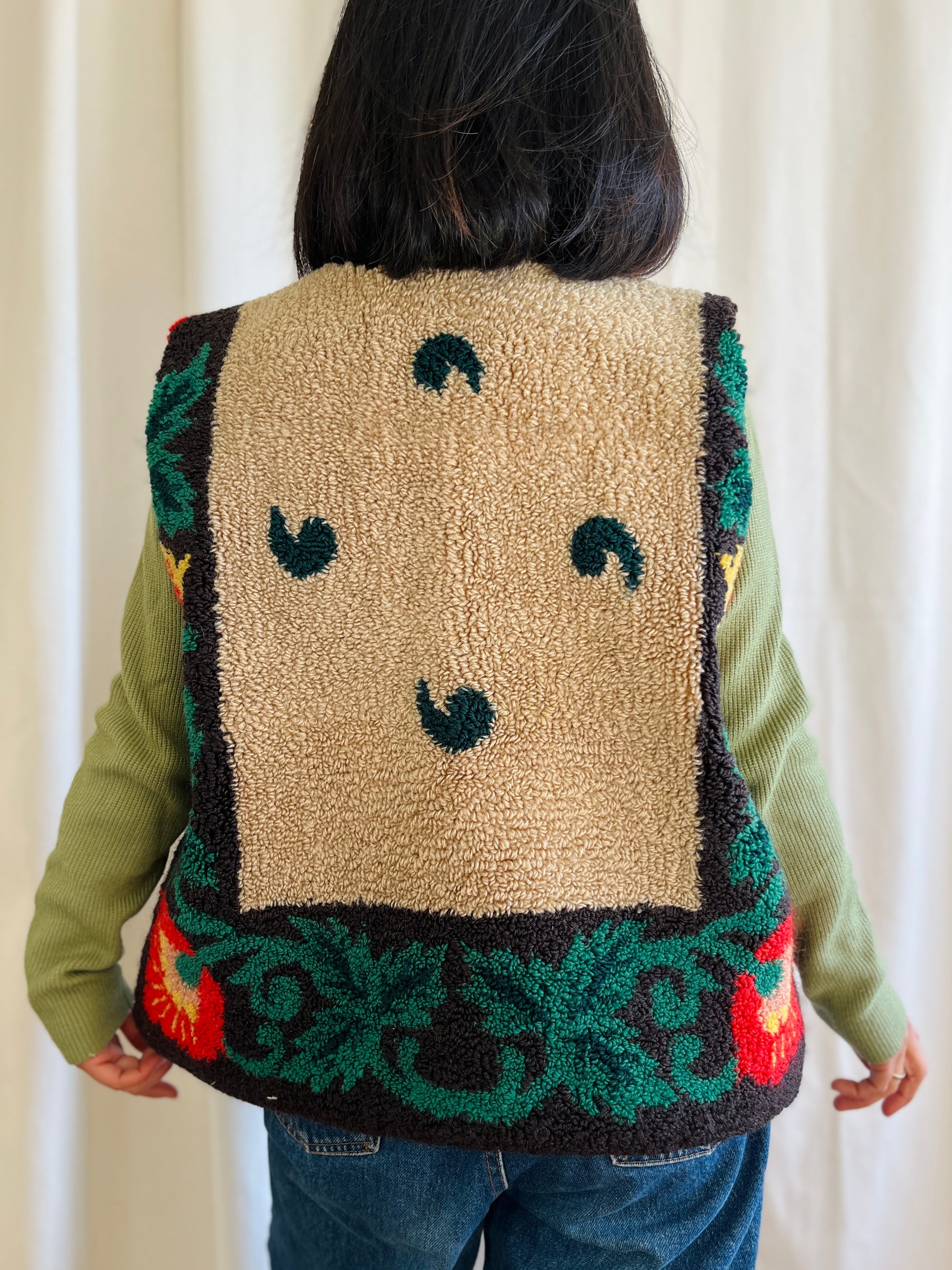 A very unique piece of creation, made from a handmade wool rug, soft and warm. featuring one inner pocket and fully lined with linen fabric. Closes with two vintage buttons.