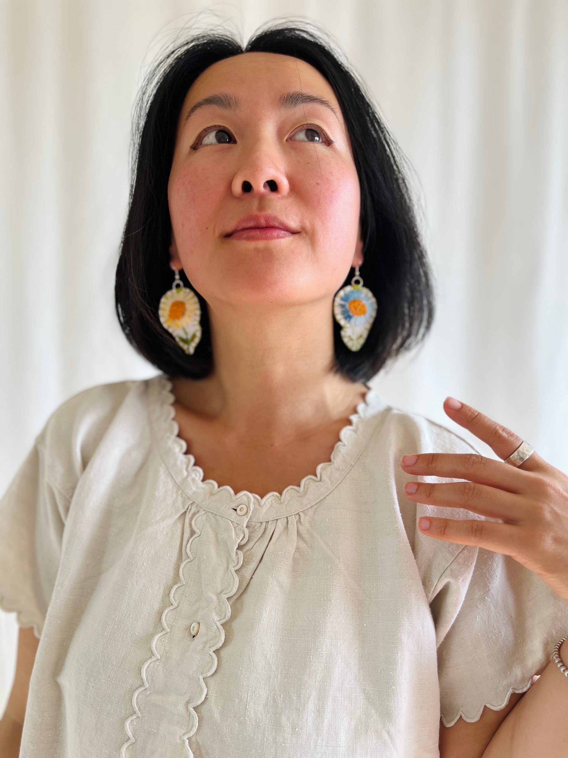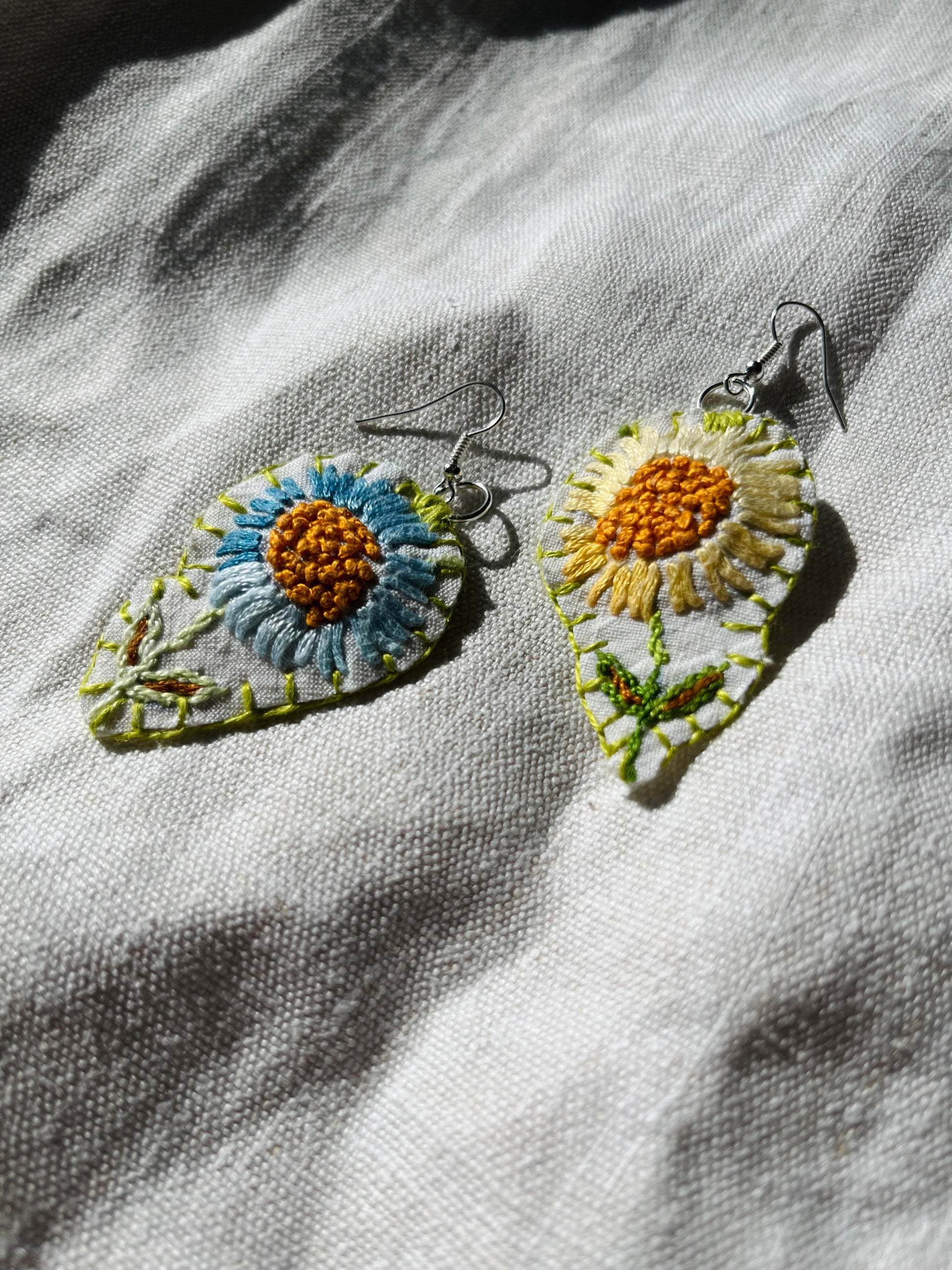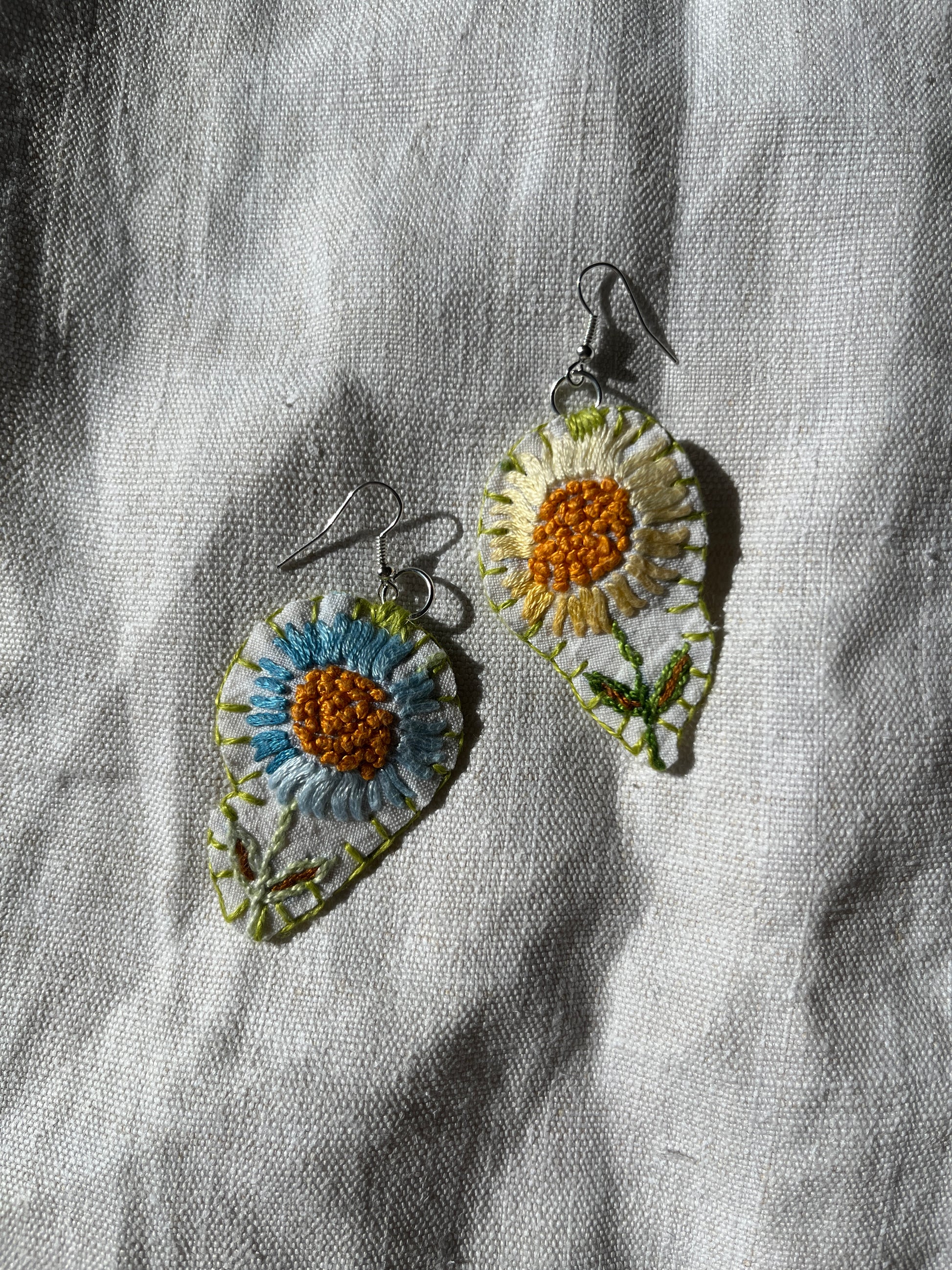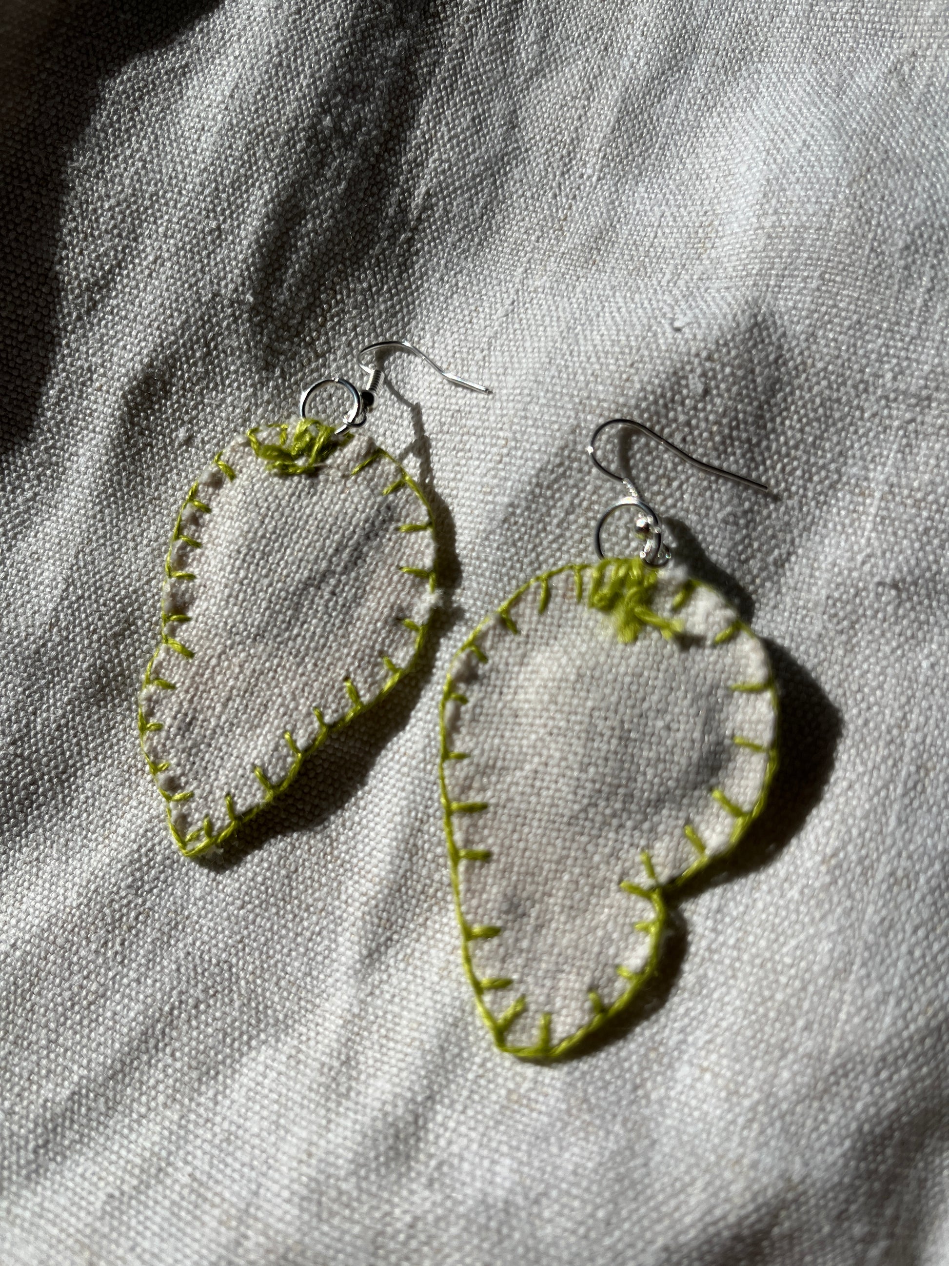 They are lined with scrap fabric of all kind, hand stitch to finish the edge, the earring metal parts are suitable for sensitive skin.