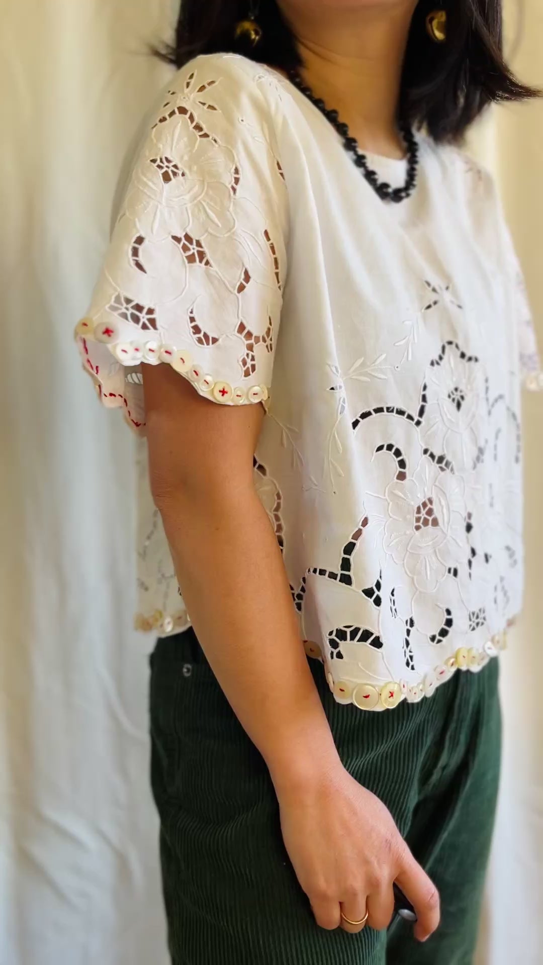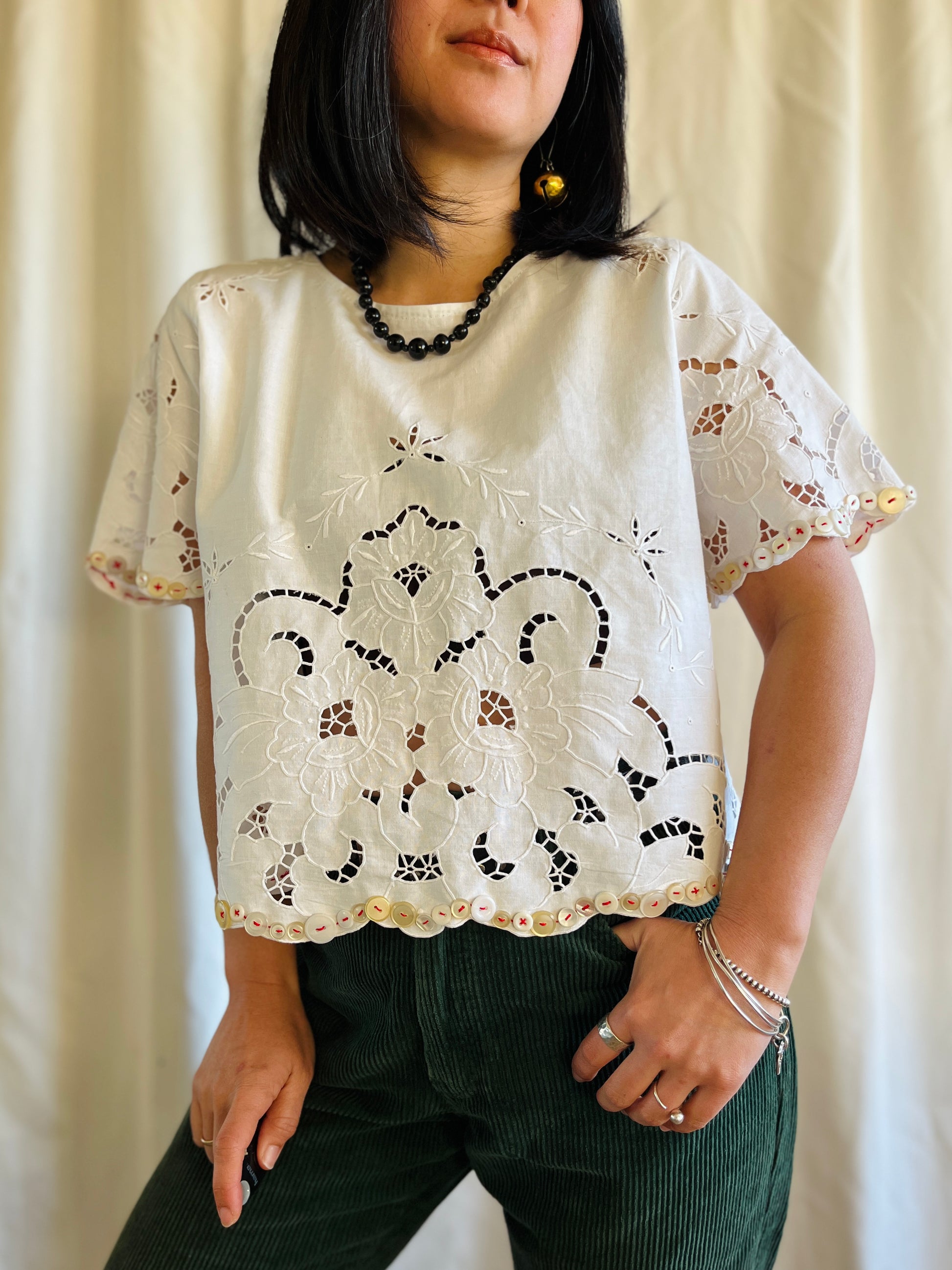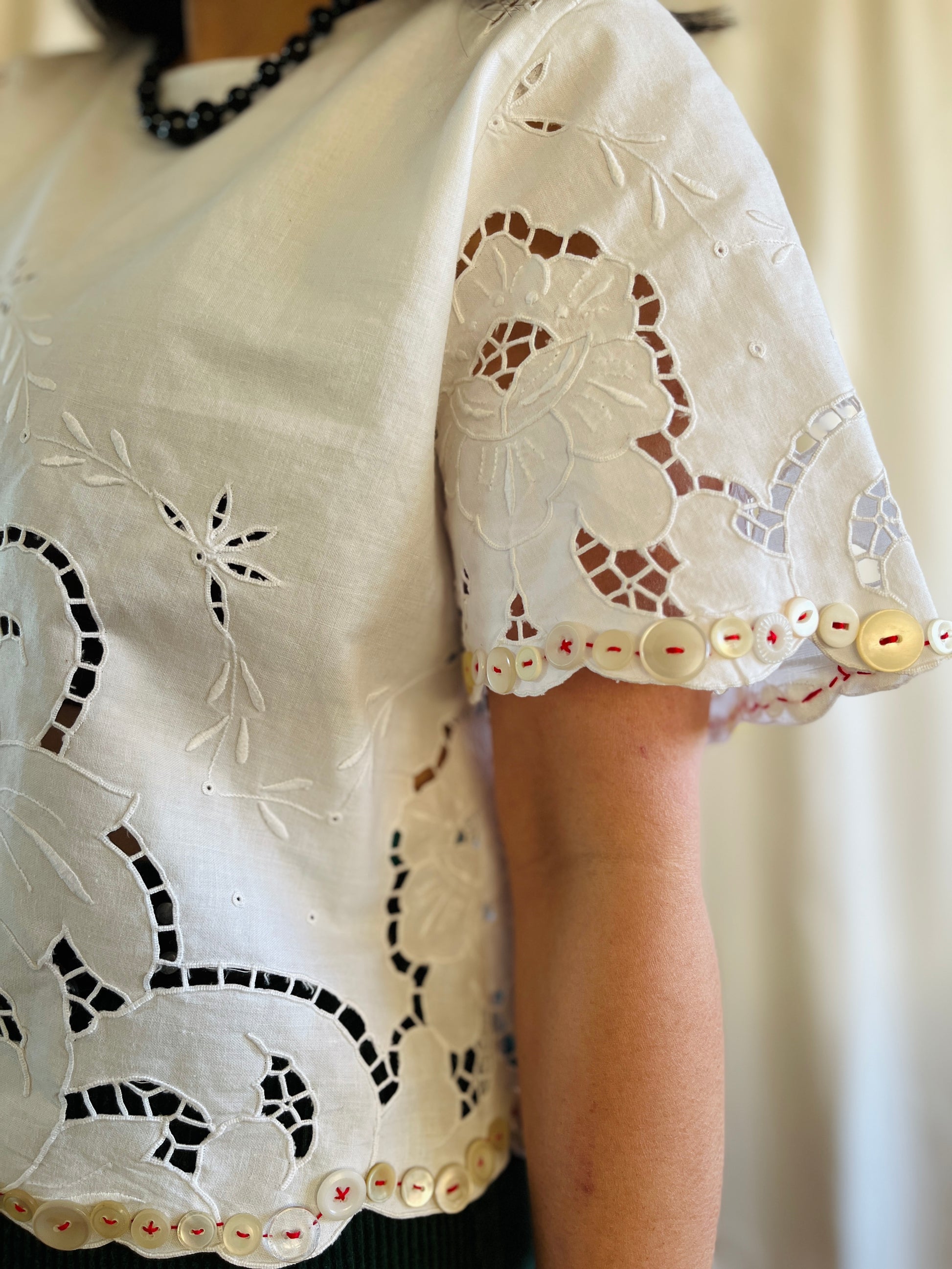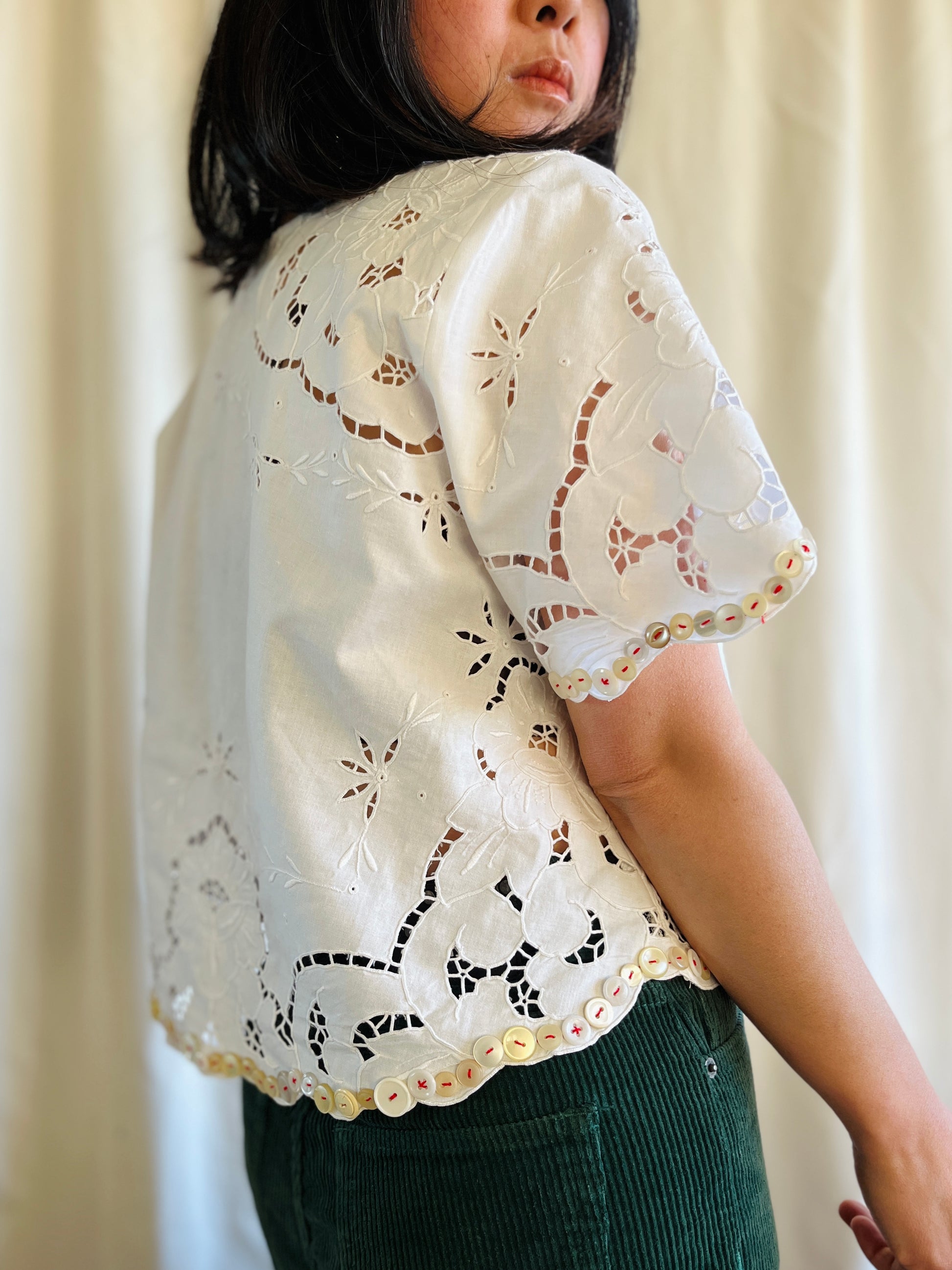 Playing with vintage buttons and cutwork cotton tablecloth, this very unique and beautiful top is born.