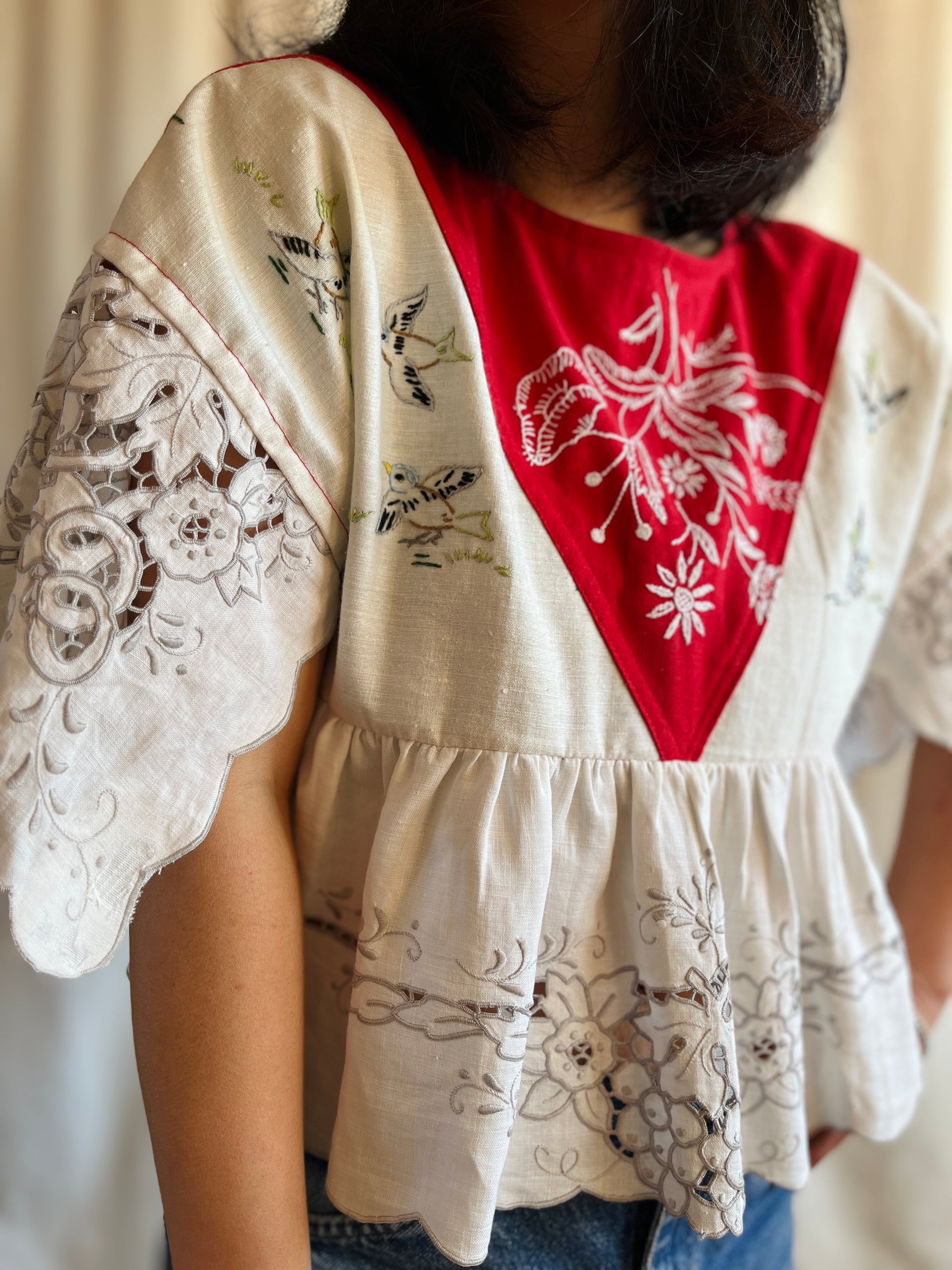 A beautiful puzzled top. Made from the leftover scraps after the other two pieces from the same series are done. Somehow I love this one the most. It is unintentionally playful! It is like our life, sometimes you just have to let the happiness finds you.