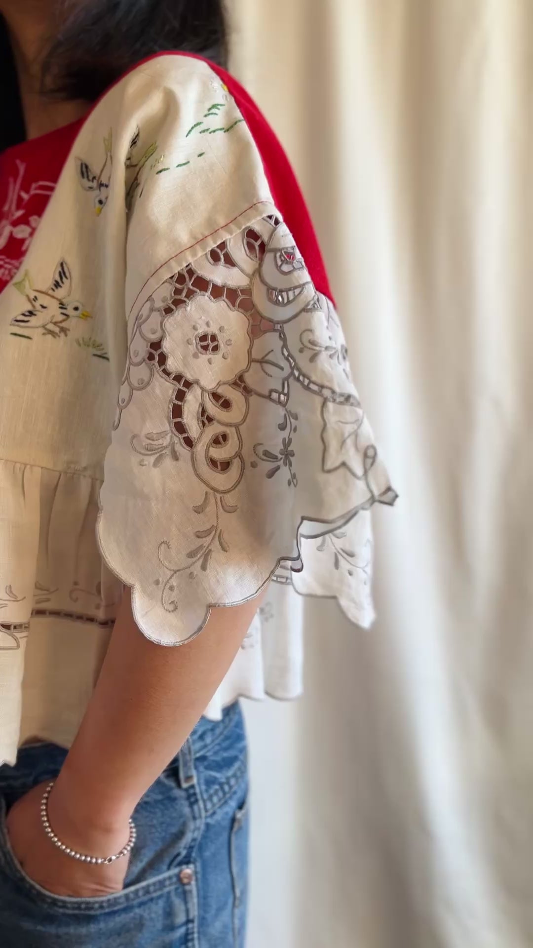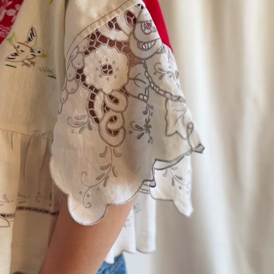 Please be aware that this is a hand-made item repurpose from a vintage / used table cloth. Therefore there are flaws, light stinks and tiny rips which is the evidence of the history one's ever lived.
