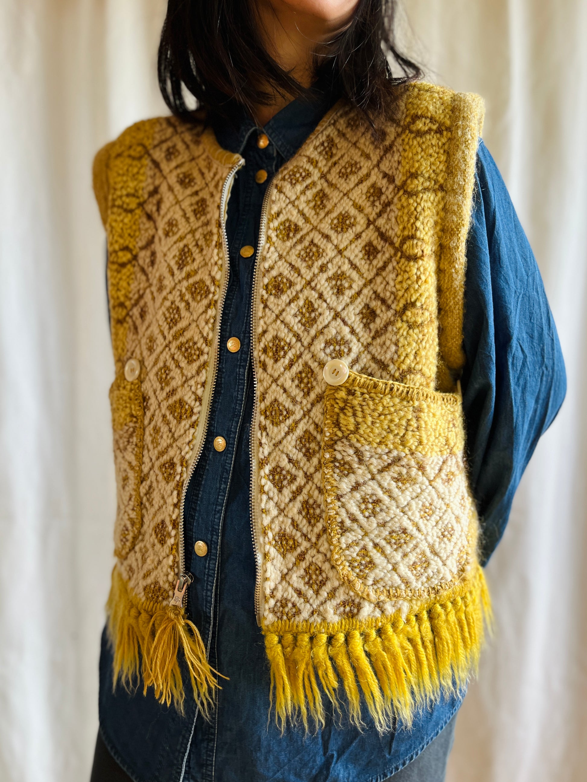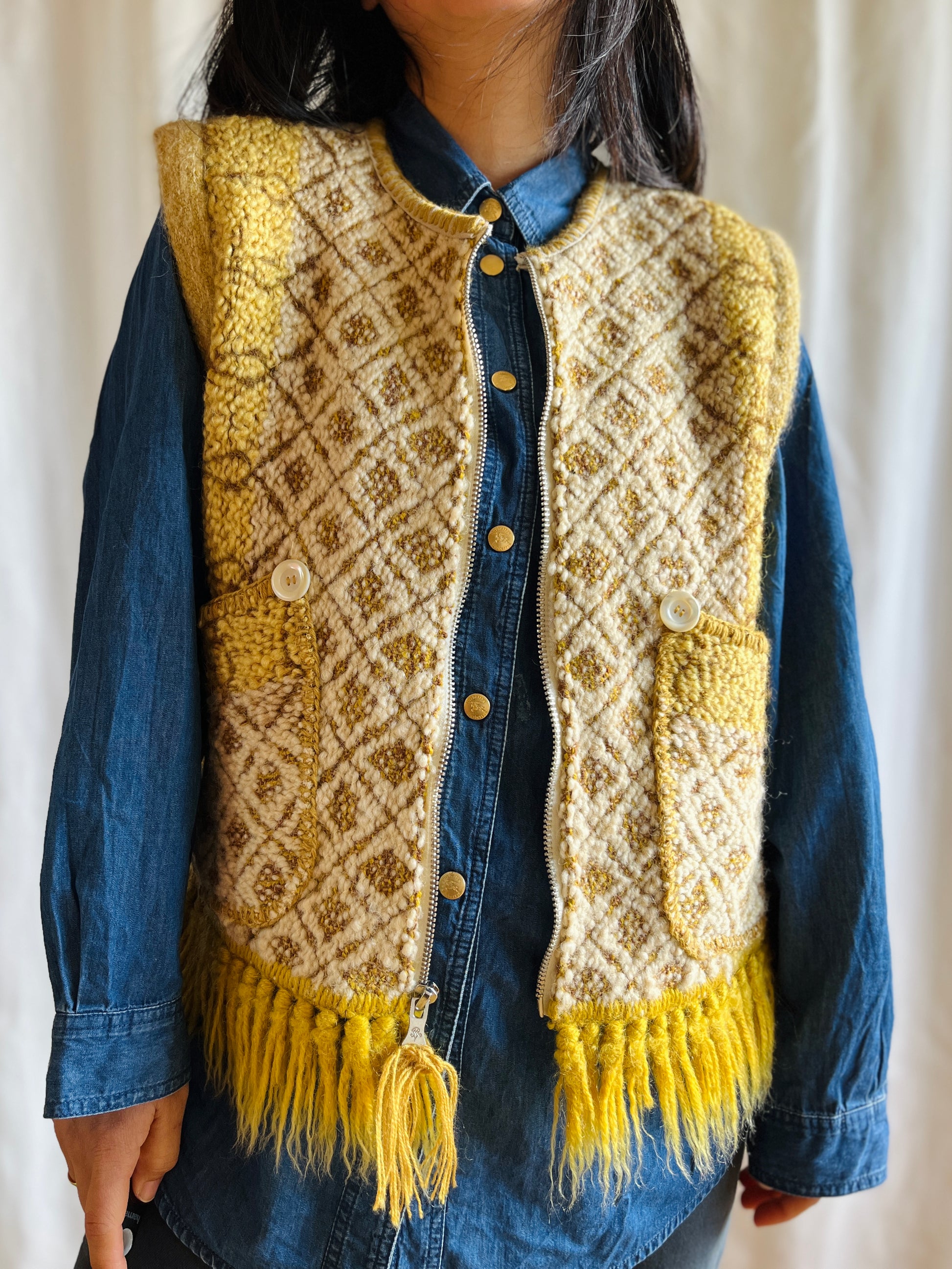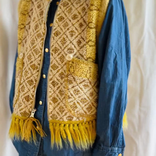 Made from a vintage handmade rug with very artistic pattern and uneven yarns. Extremely soft to the touch as it is marino wool. Two side pockets, entirely hand stitched finish.