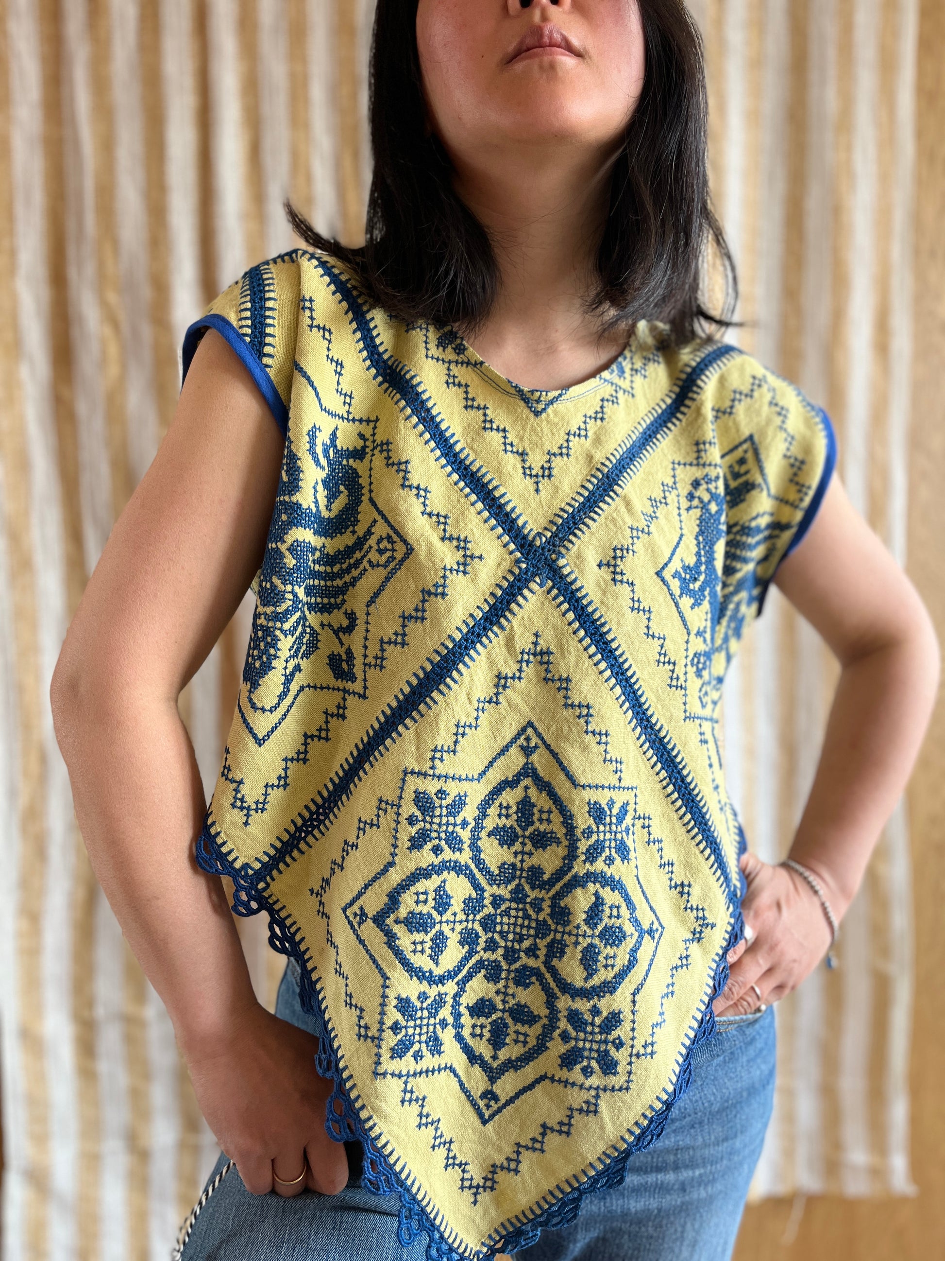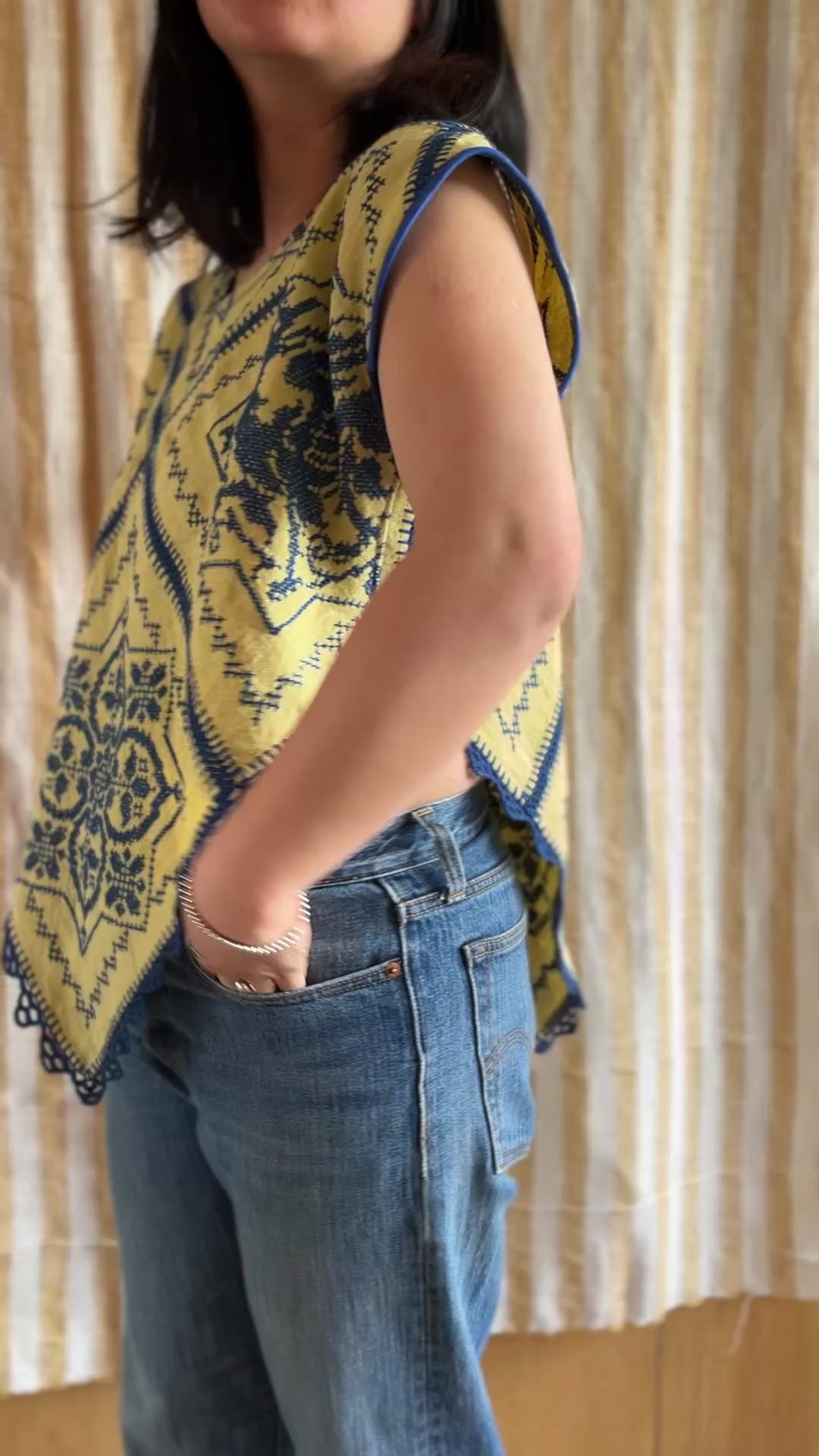 This particular tablecloth featuring ancient dragon motif and mythological design which makes it so rare and so special. It had been stored in my tablecloth cabinet for over two years since I couldn't find a perfect pattern to turn them, but not anymore, I think this diamond blouse pattern is just the perfect way to honor this stunning piece of women art.