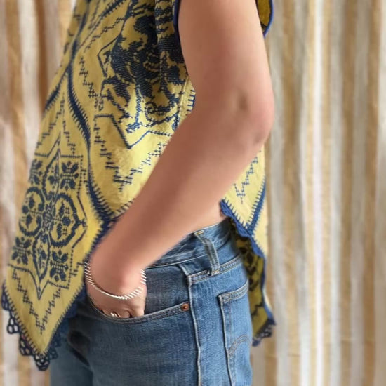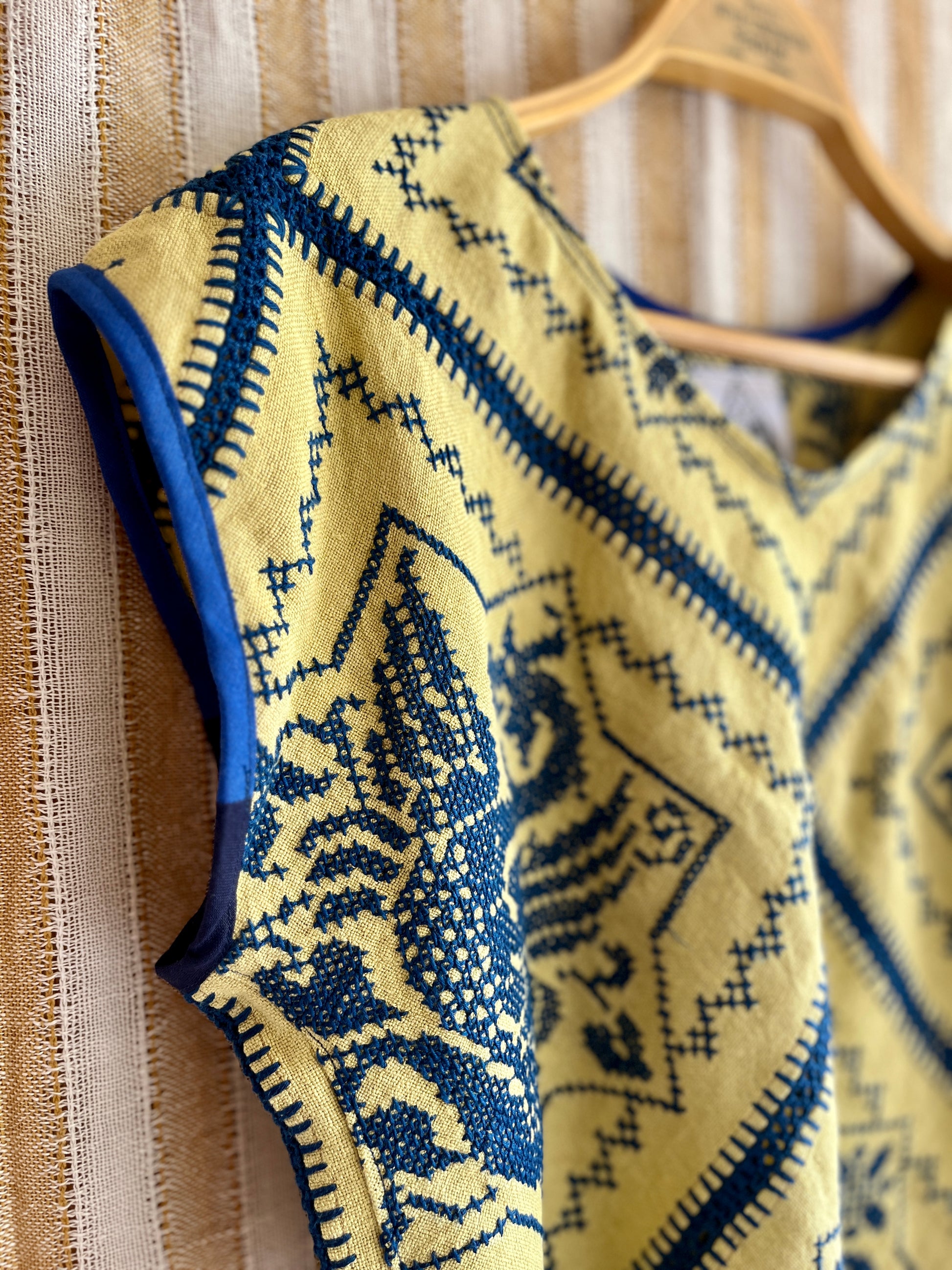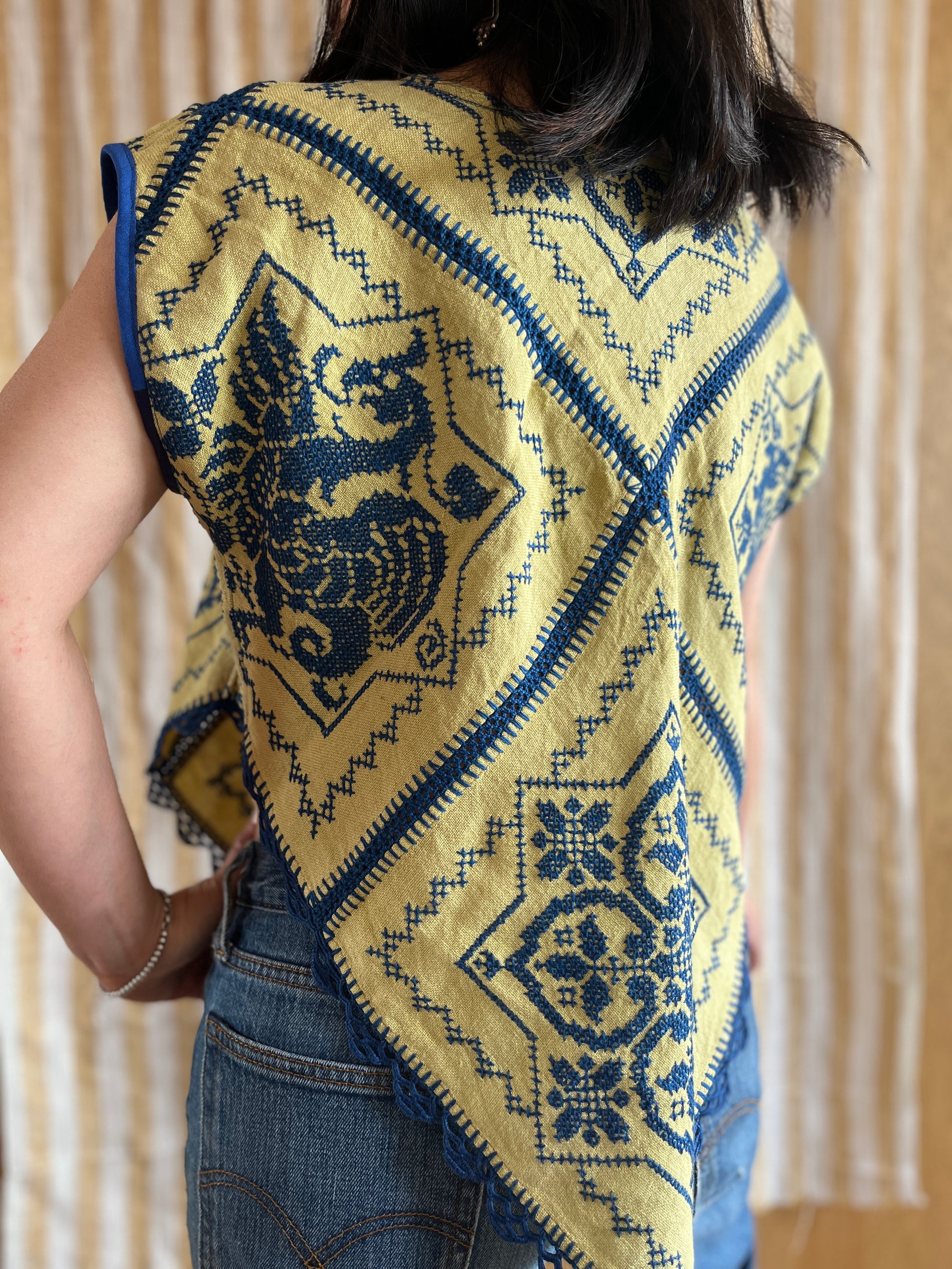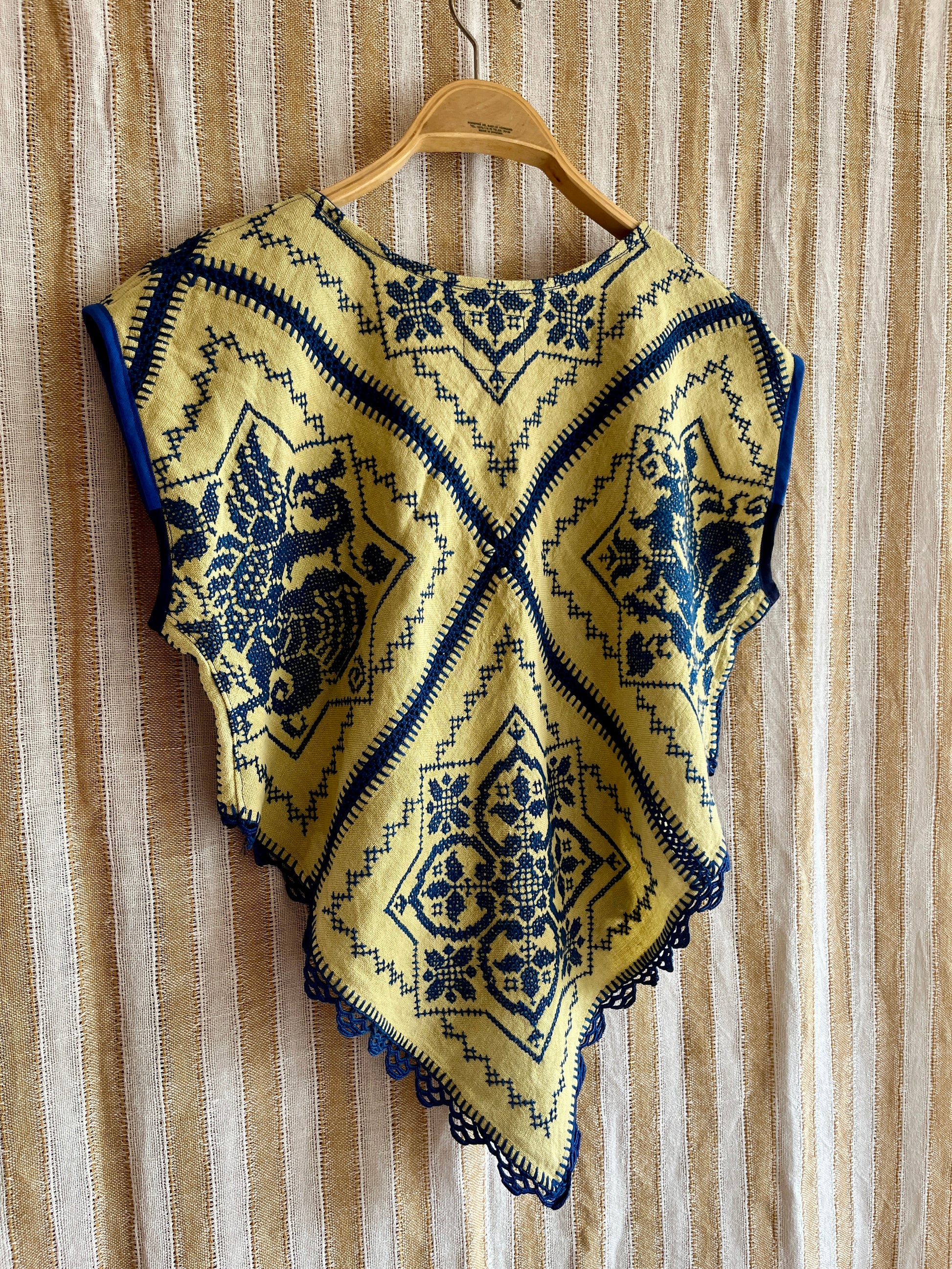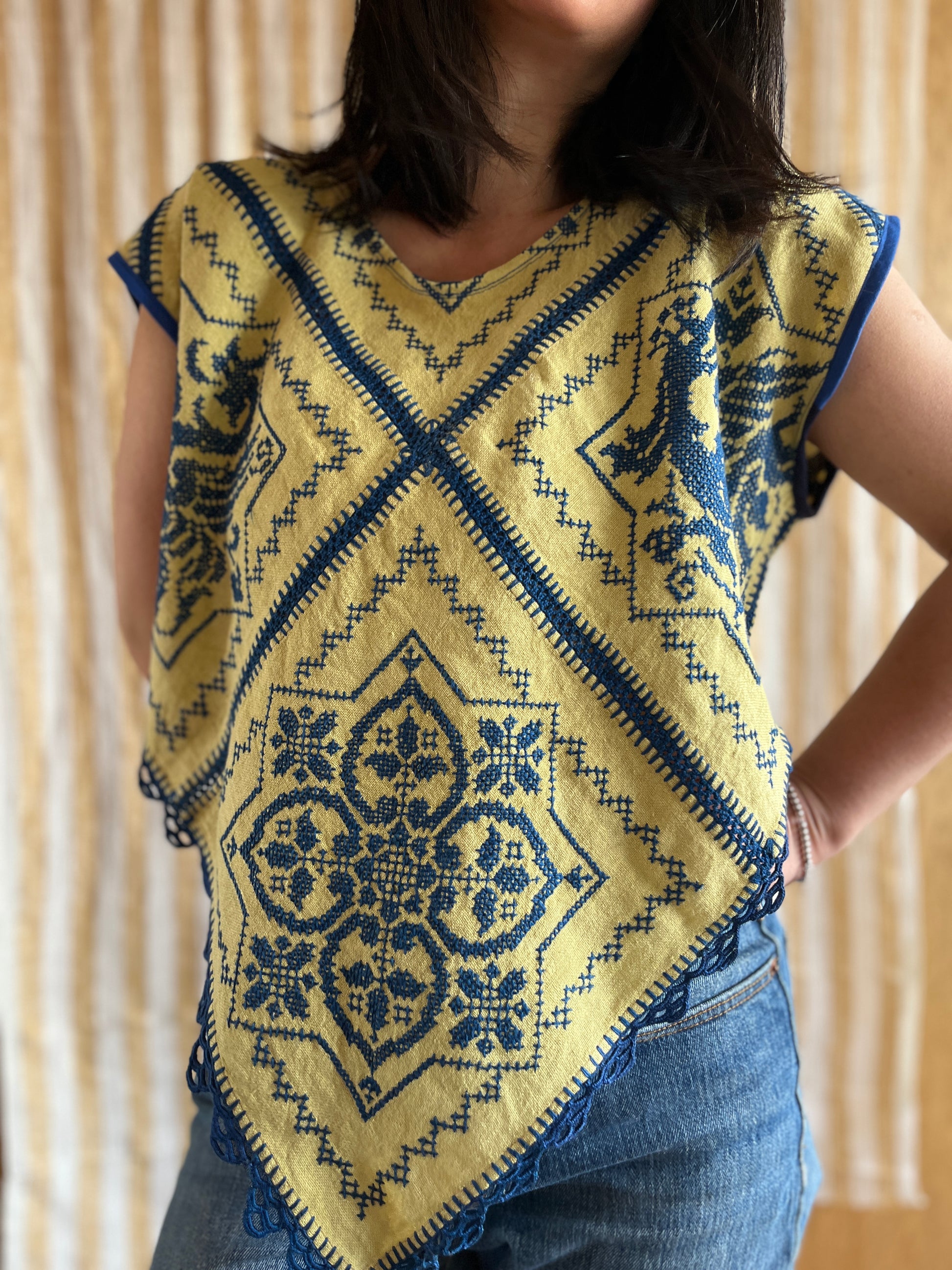 Made from heirlooms bordered squares linen tablecloth with blue embroidery and crochet interlocking and trims. These are highly skilled crafts from the old days, this tablecloth was in excellent condition.