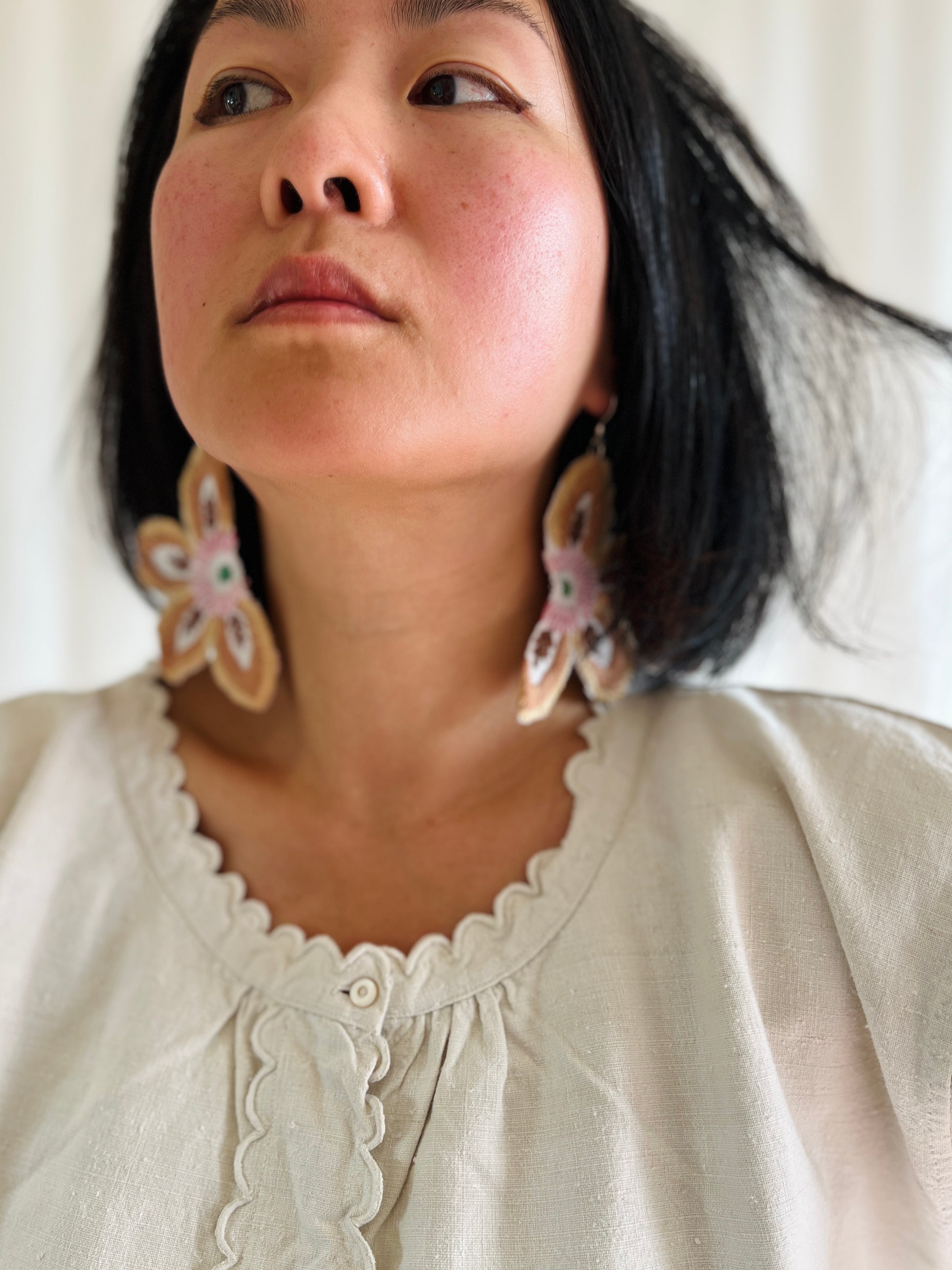 They are lined with scrap fabric of all kind, hand stitch to finish the edge, the earring metal parts are suitable for sensitive skin.